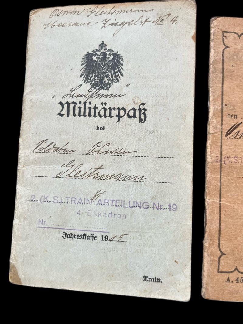 This is a set of WW1 German Military documents which belonged to the same person, Im struggling to make the name out though, its a Soldbuch and a Militar pas, it looks like he worked in the Train department 4 Squadron.