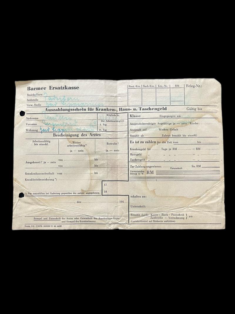 This is a German Barmer Health Insurance certificate, the date is for the 194?s, but it hasnt been filled in.
