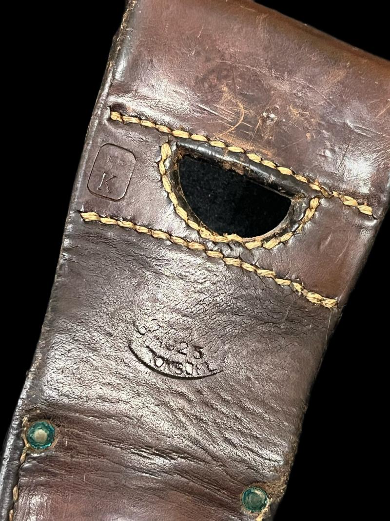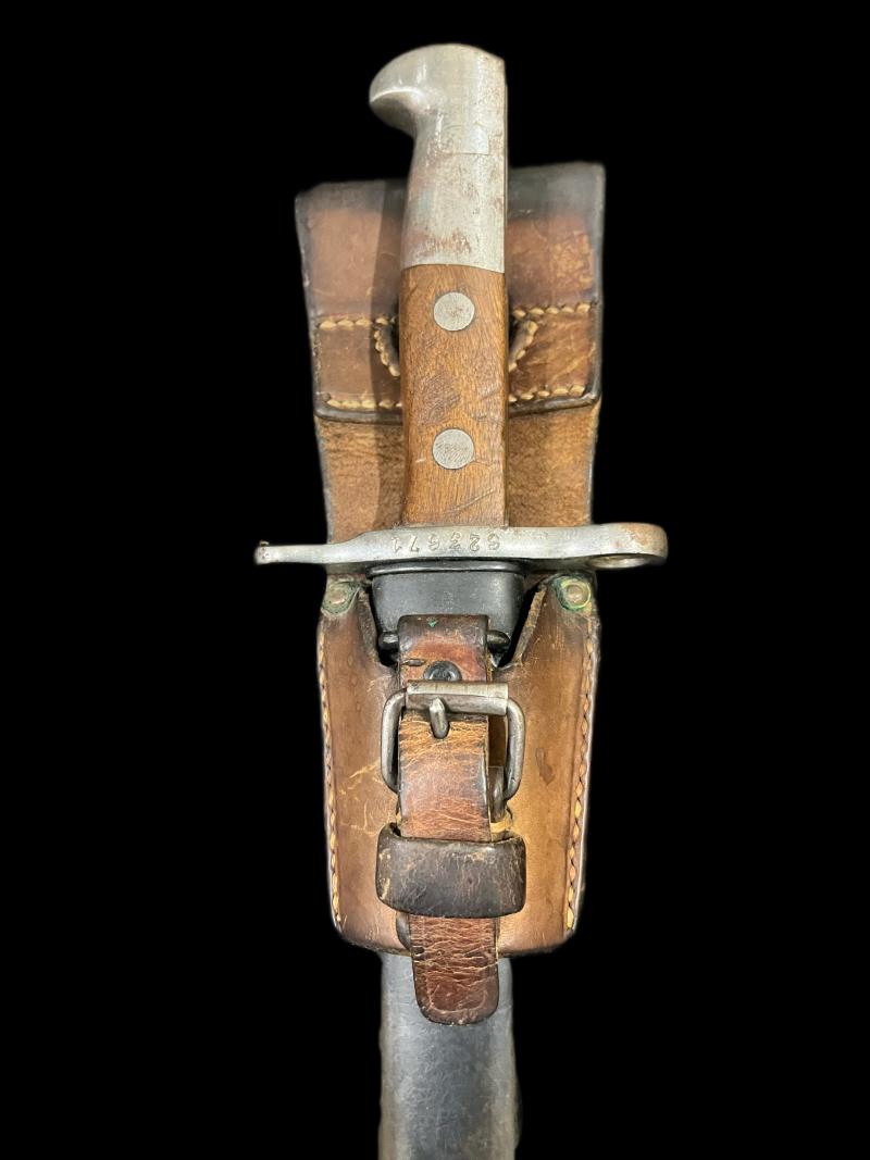 This is a nice Swiss Schmidt Rubin M1889 Bayonet which comes with its scabbard and leather frog, the blade has the makers Elsener Schwyz and the number 623671 on the cross guard, and the frog has the date 1923 with the Swiss stamp on it. UK sales only.
