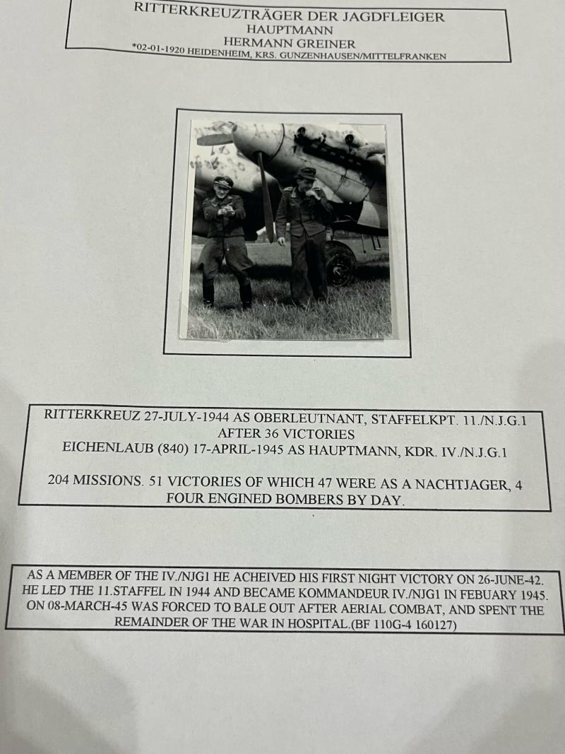 This is a signature and note from WW2 German Luftwaffe pilot Hauptmann Hermann Greiner.