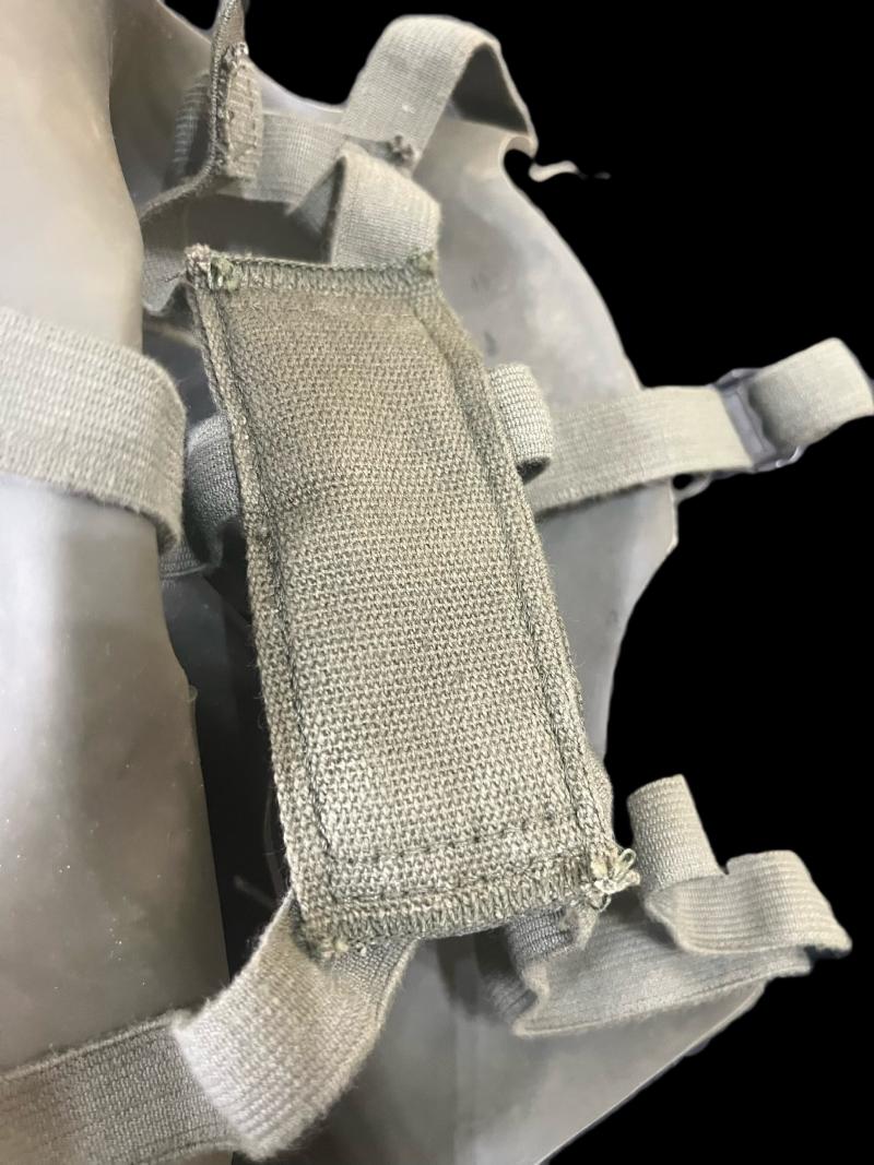 Nicknamed the 'Grasshopper' for its unusual appearance, the XM28 gained favour by pilots, LRRPs, Tunnel Rats and SOG teams due to its extremely lightweight and compact design. The mask can completely fold in on its self which allows it to just barely fit into its waterproof pouch. The pouch features belt keeper clips on the rear to attach it to various equipment but was frequently worn under the shoulder on the suspenders/harness.