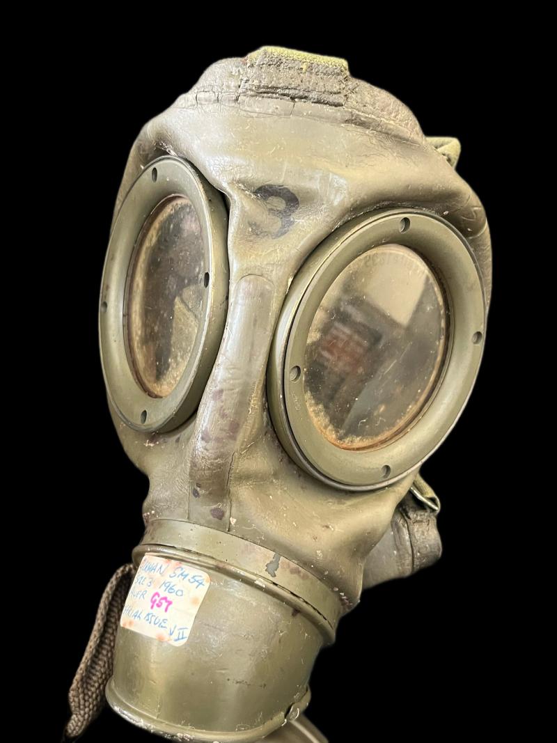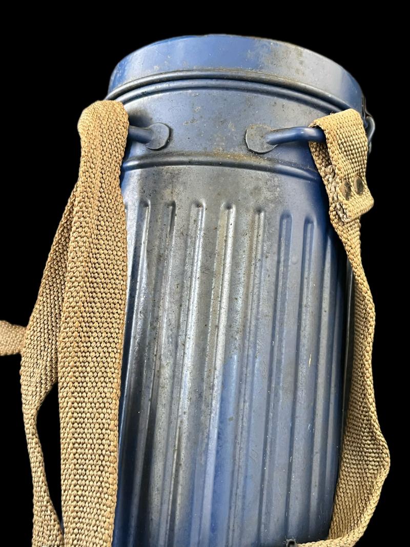 This is a German GM54 Gas Mask with its filter and tin, the mask is a size 3 and in good condition. The blue tin has some sort of dark staining to it.