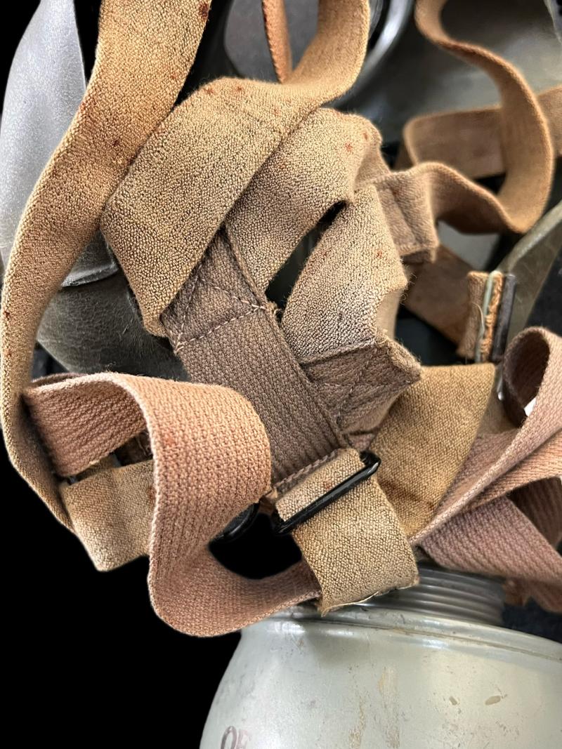 This is a nice WW2 British Civilian Gas Mask with its rare black bag, Perhaps designed for a Lady to carry it around with her, the mask is dated 1939 and all 3 straps are in great condition. This one is a size Medium.