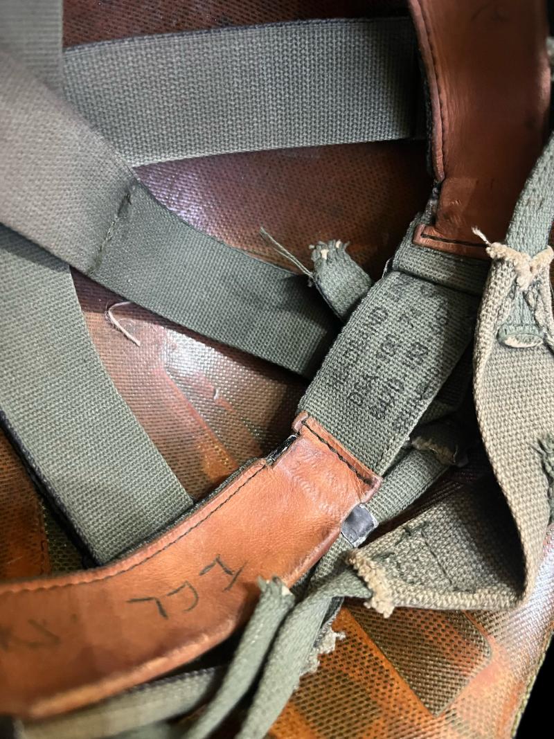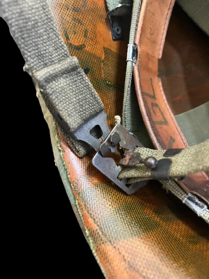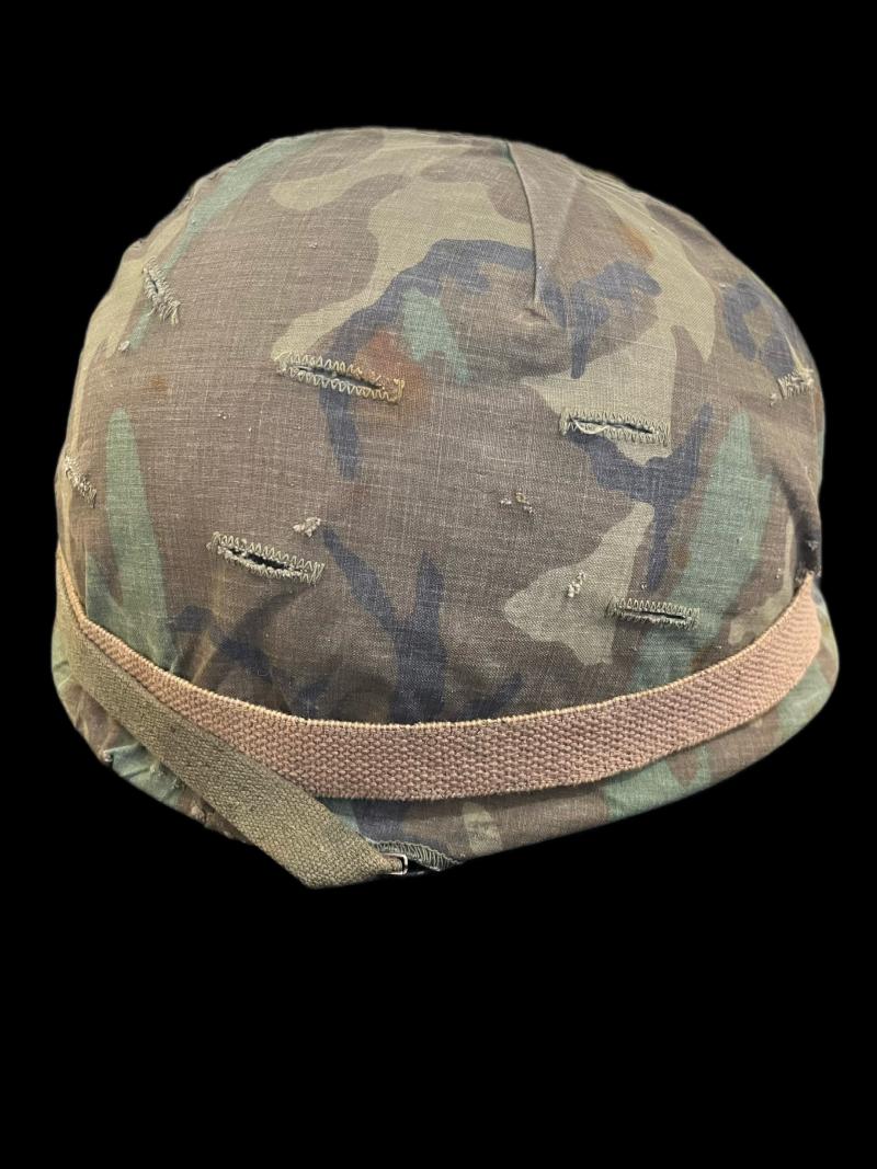 This is a U.S. M1 Helmet with a 1974 dated liner, complete with chin strap and a Woodland camo helmet cover.