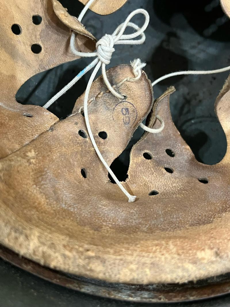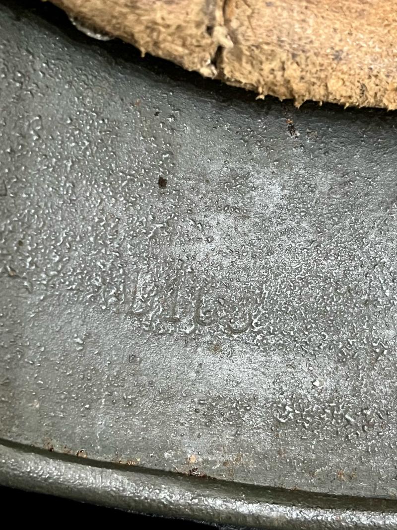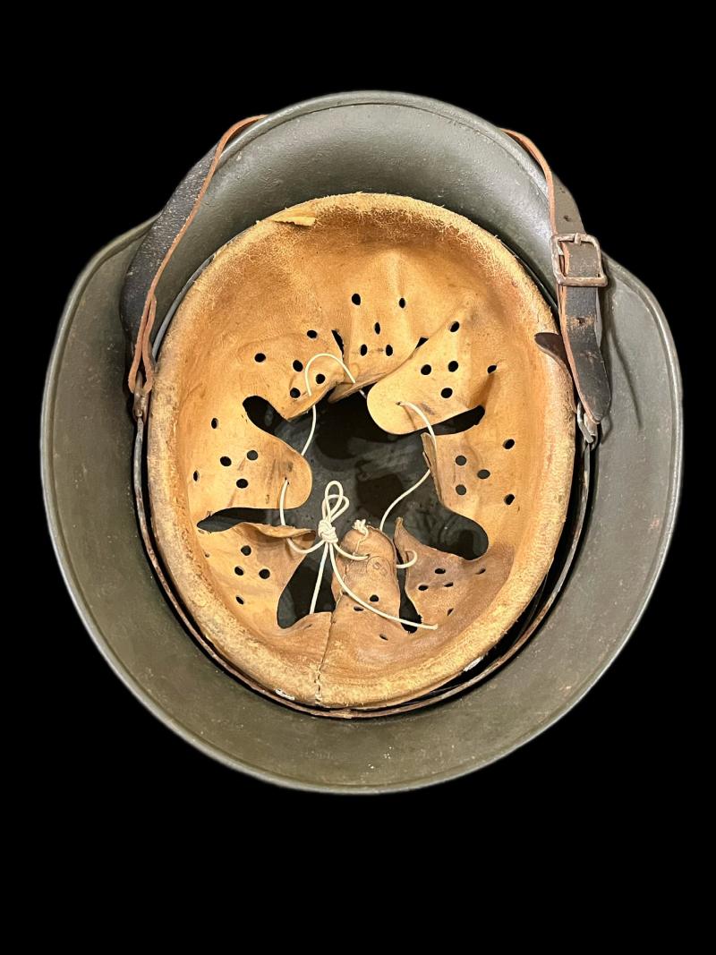 This is a very nice and rare WW2 German M40 Single decal SS Helmet, the helmet still maintains majority of its green paint, fitted with a 1942 dated chin strap and a nice size 59 helmet liner, the liner band rusting to it and some wear along the edge of the liner, the shell looks like a NS66 but its difficult to make out and the batch number is really difficult to make out, the decal is about 90% complete where the runes can easily be seen. These M40 NS66 SS helmets are really difficult to find and not many are known to exist either. A stunning helmet to have in the collection.