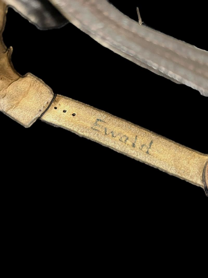 This is a very nice named WW2 German Luftwaffe LKp S 101 Pilots helmet with its original labels inside and still fitted with its early throat mics and plug, the label looks to be dated April 1940 but it is difficult to make out the exact year and is a size 56, this one has the Nr.26617, the ear pieces inside still has their plastic covers, This one is also named Ewald on the mic strap which could of potentially belonged to Wolfgang Ewald who was a German Luftwaffe ace and recipient of the Knight's Cross of the Iron Cross during World War II but I dont have anything to confirm it belonged directly to him, overall a fantastic condition and would look fantastic in a collection.