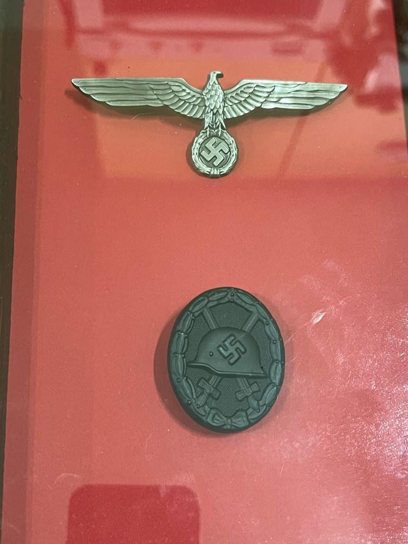 This is a nice reproduction WW2 German medal display with a repro black wound badge and a repro Eagle above it.