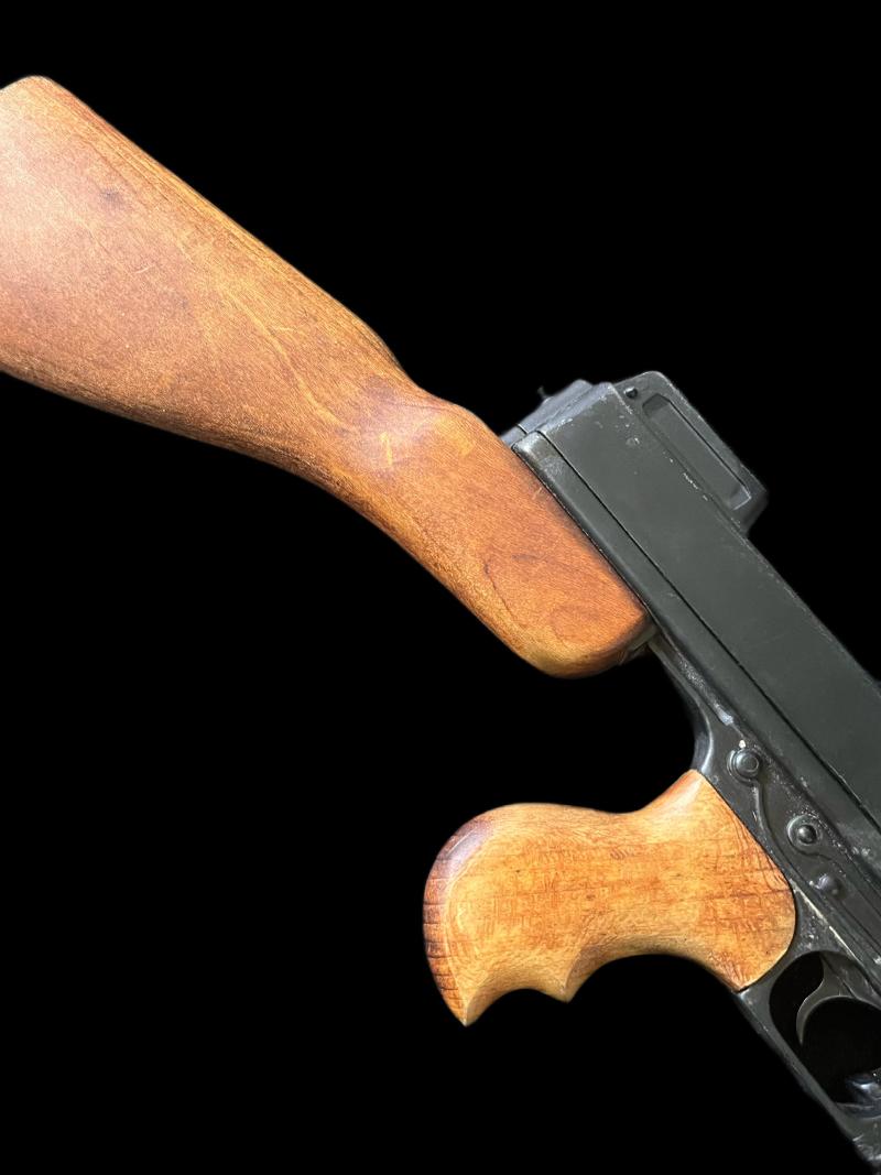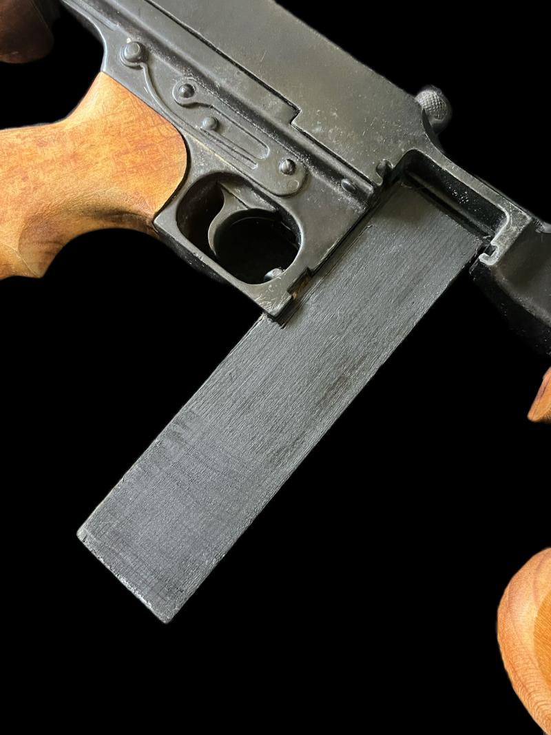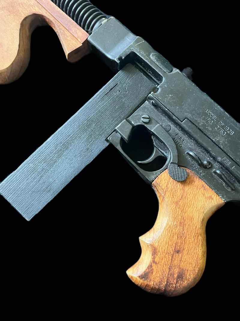 This is a nice replica Denix of the U.S Thopson 1928 SMG which has been aged up, this one has had a wooden magazine made and fitted, it is able to cock and dry fire and in used condition, For UK Sales Only.