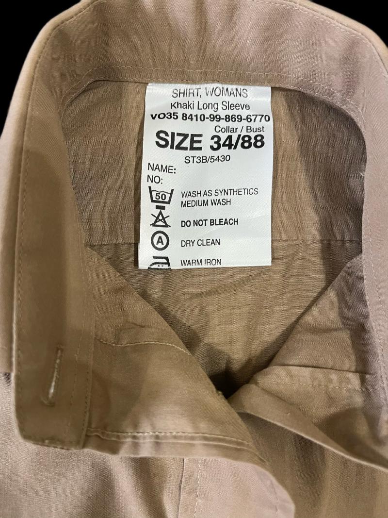 This is a British Woman's Khaki long sleeve shirt, there is a very small hole on the right sleeve by the armpit, size 34 collar and 88 bust.