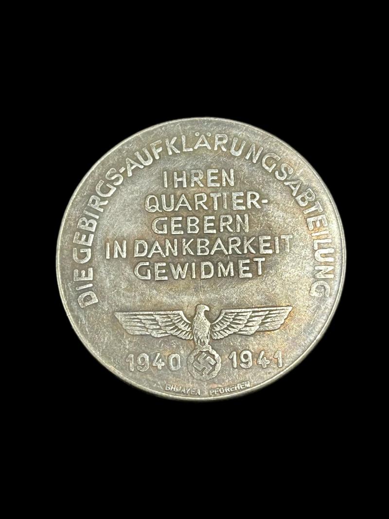 This is a very nice reproduction 1940-1941 Medal- Die Gebirgs-Aufklarungs Abteilung. This item is on consignment.