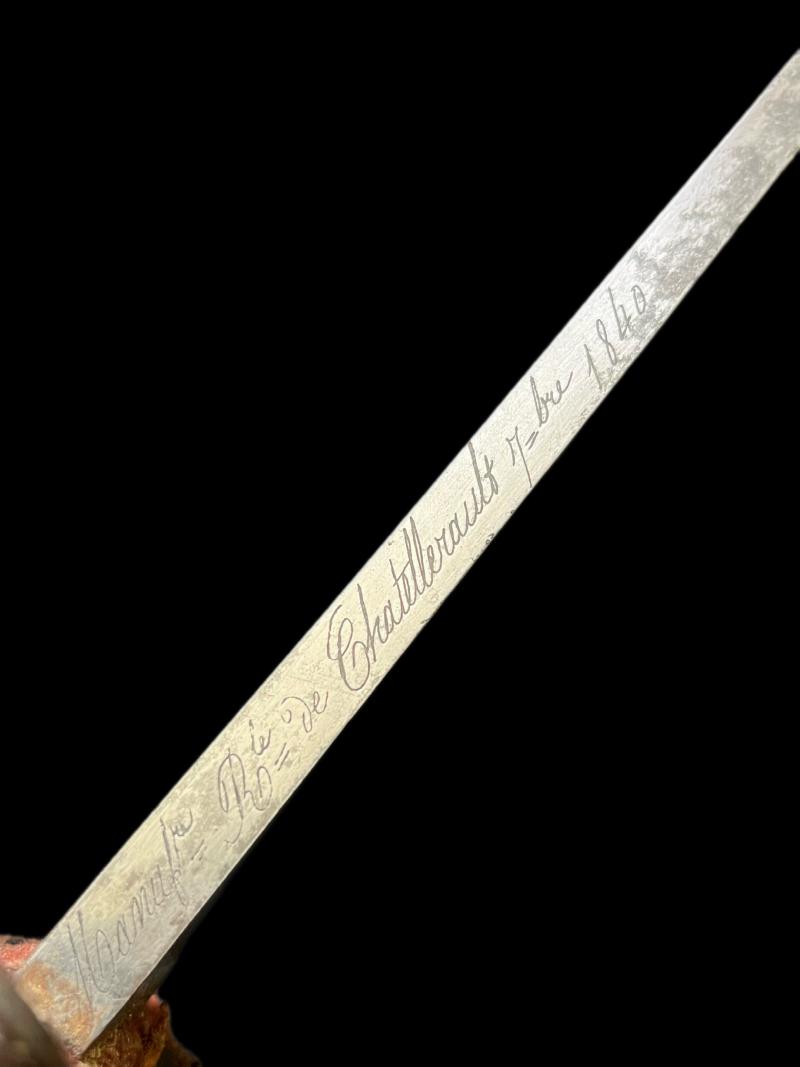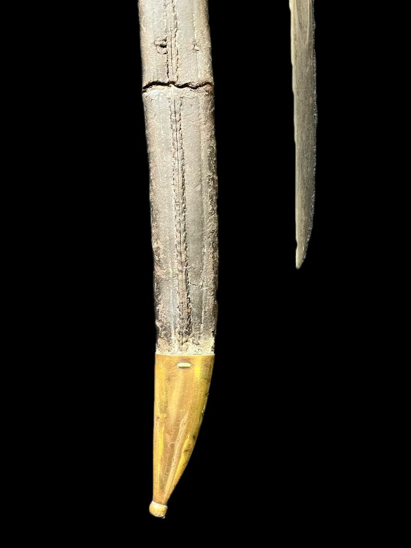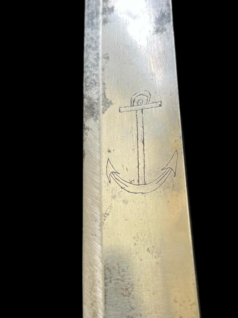 This is a French model 1833 naval cutlass, dated 1840. 1359 grams, 32.5" long, 26.5" long blade. French model 1833 navy cutlass dated 1840 with original leather scabbard (now repaired), both with French naval inspector's mark (an anchor on scabbard and an anchor and both sides of the blade); in pretty good condition for its age. Age Restricted Item. Proof of age must be provided. U.K. Sales Only.