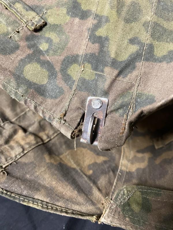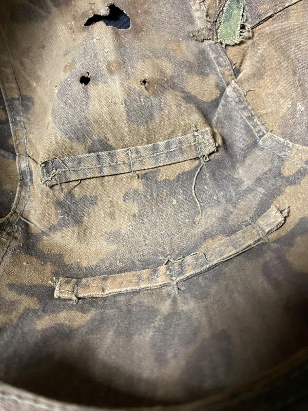 This is an original German WAFFEN-SS camo helmet cover, has a couple of rust stains and holes which to me makes it even better and would make a great addition to a collection, has all its loops in place as well as its 3 springs, the attachment clips are all there, the helmet it is on is not included in the sale, it is just the cover itself.