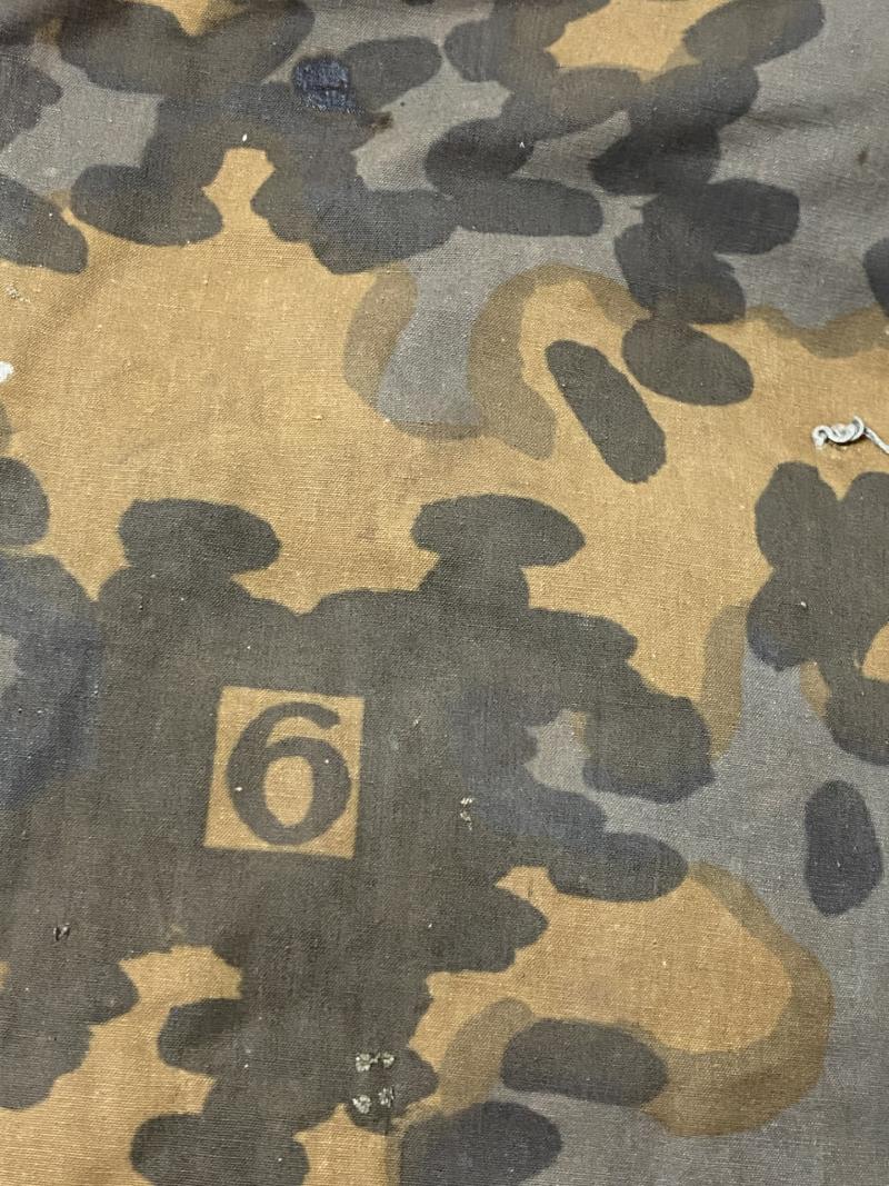This is a nice Waffen-SS reversible oak leaf pattern zeltbahn, there are some nick and repairs to this one as you can see in the pictures, with good bright colour to the camouflage, this one has the number 6 on it, some of these were paired up when they came of the machinery 1-2, 3-4 and 5-6, this one is number 6.