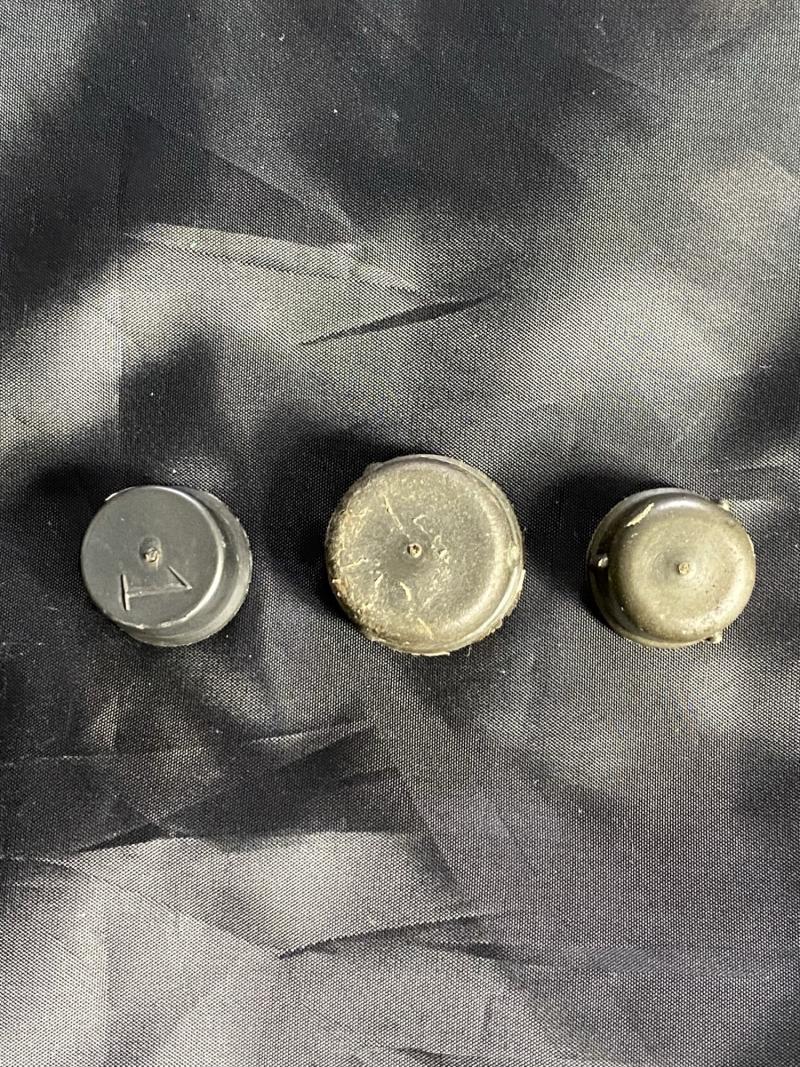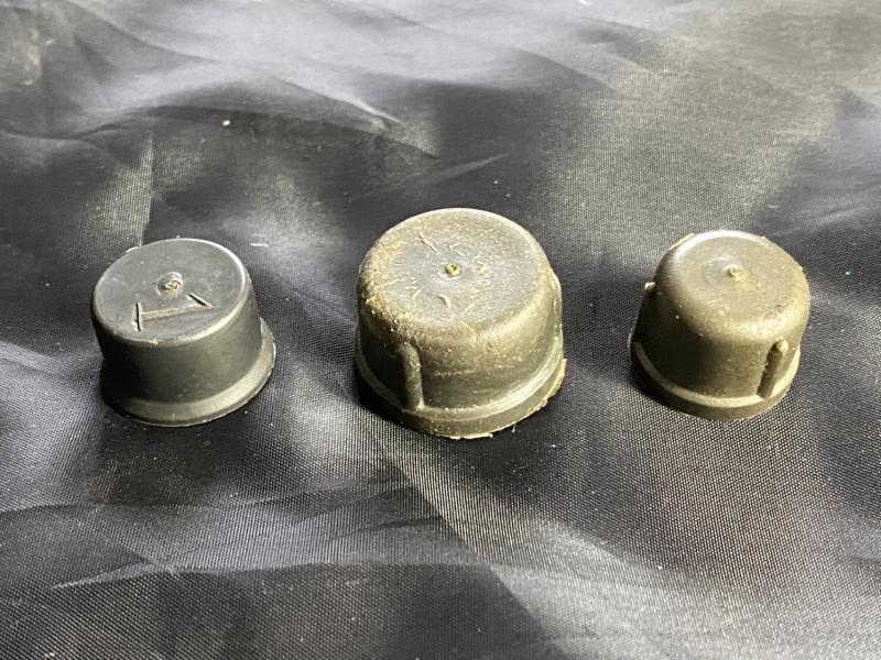 These are 3 x German muzzle covers, I believe one is a K98, the other is a MP40 and one is a MP44 Cover.