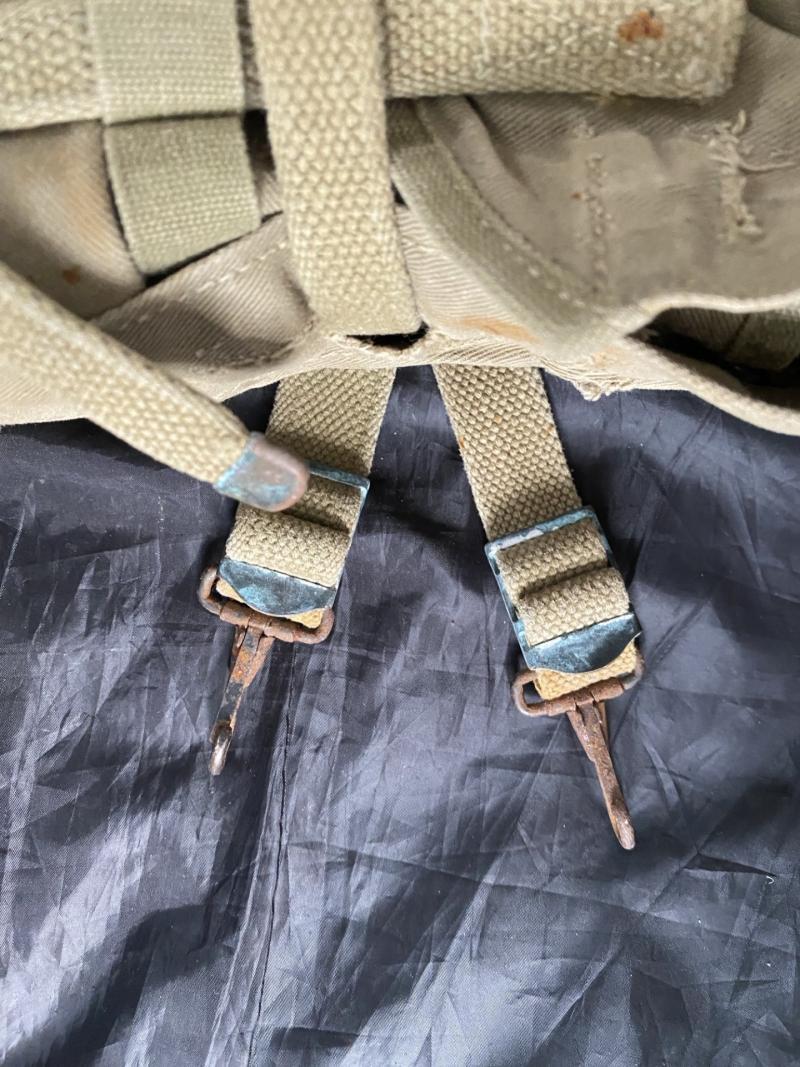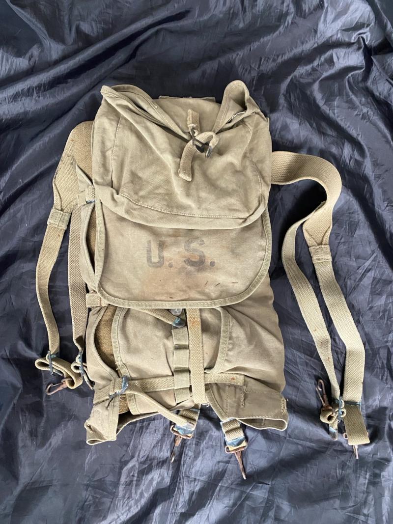 This is a nice used WW2 U.S. M1928 haversack which looks to be dated 1942 and maker. It has a Mess tin pouch at the very top and inside the Haversack is a WW2 U.S. Blanket.