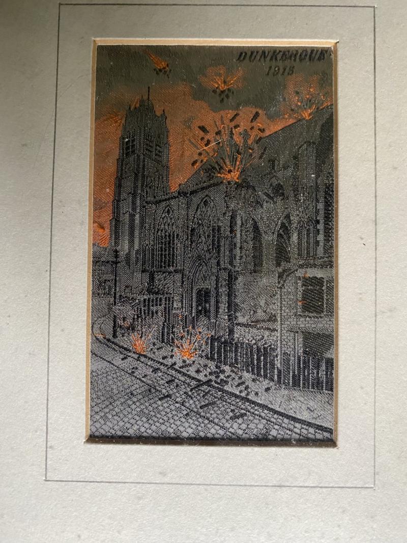 This is a nice framed Silk Embroidery of Dunkerque Cathedral Bombing "Dunkerque 1915" the picture is approx. sizze is 2.5" x 4".