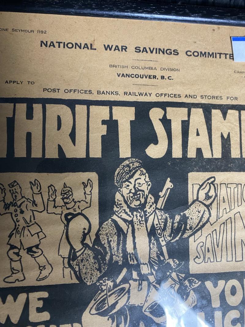 This is a nice framed National War Savings Committee Vancouver B.C. Thriftstamps "We licked them at the front, you lick them at the back", Approx 12" x 9.5".