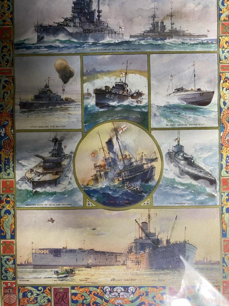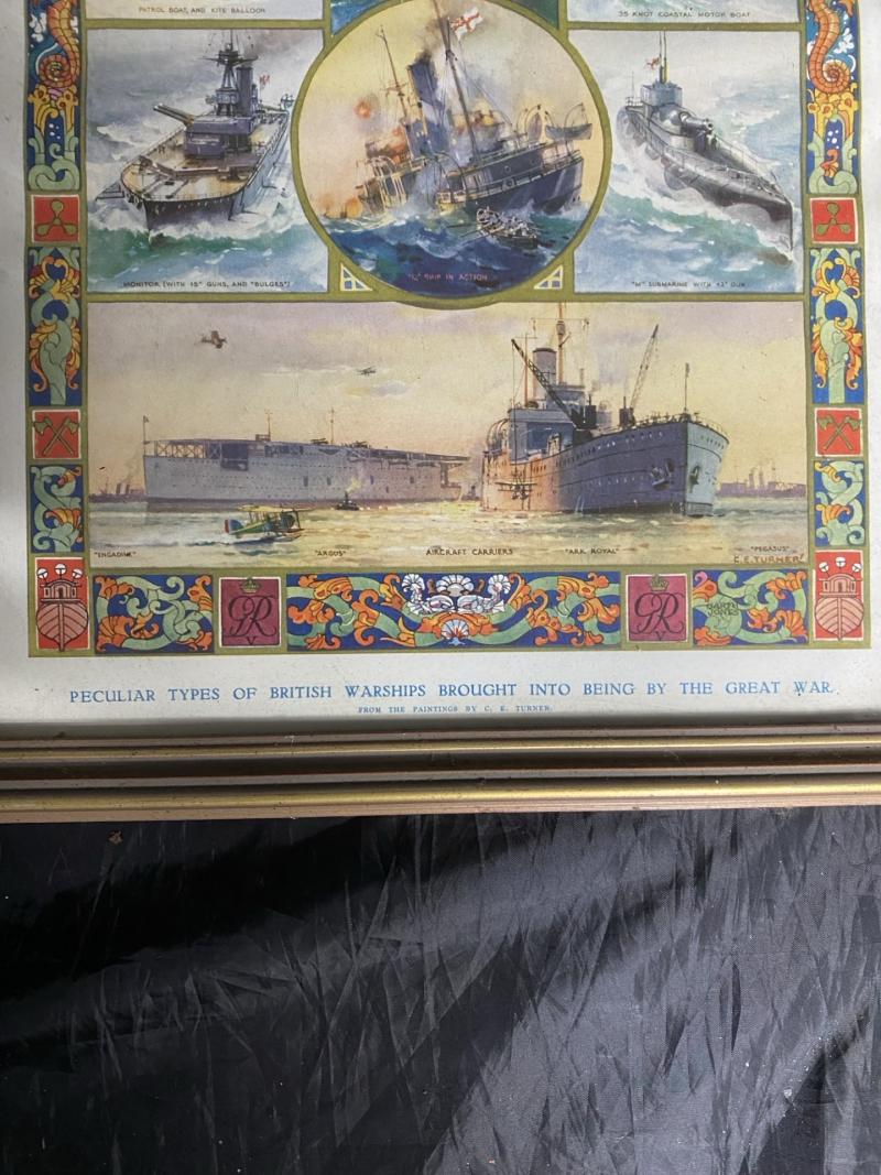 This is a nice framed picture of "Peculiar types of British Warships brought into being by the Great War" Approx. 10" x 14".