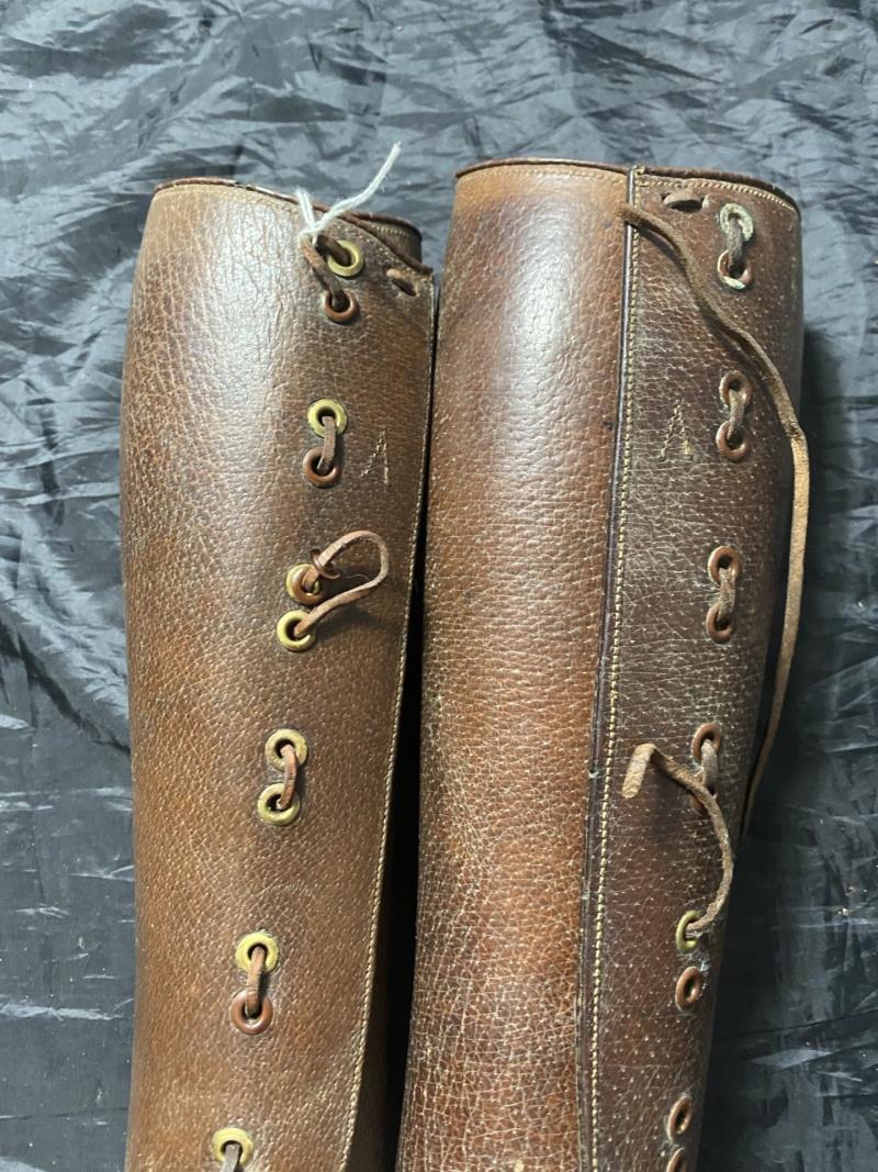 This is a nice pair of WW1 British Officer's Rawhide leather gaiters, which both are stamped and also both has an ink stamping 16 on the inside.