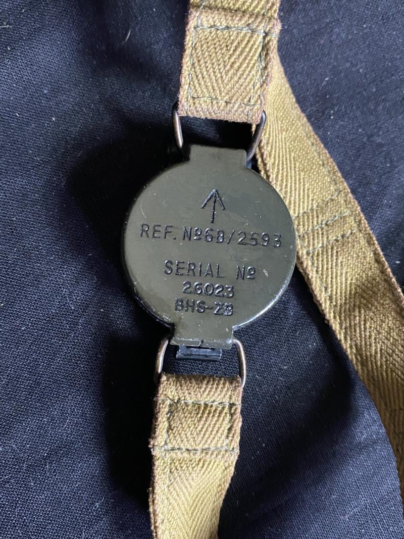 This is a very nice British Military wrist compass with its original strap, in nice working condition, it is also stamped on the back Ref. No.68/2593 with the serial number 26023 bhs-zb as well as the British Broad Arrow.
