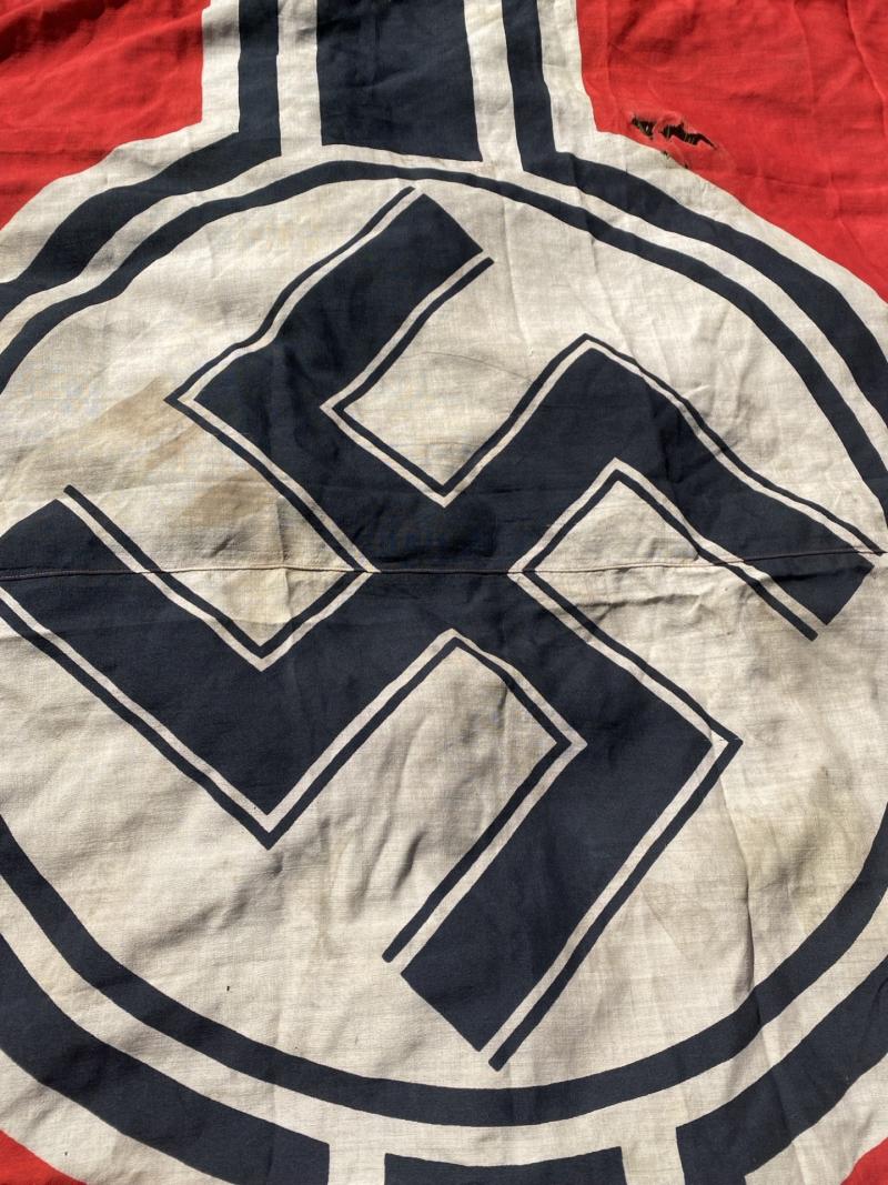 This is a huge WW2 German Kriegsmarine 170 x 320cm battle flag retaining excellent colour. Large eagle and swastika over and the ‘M’ stamping to the canvas selvage edge. Complete with its rope lanyard. There are some tears to this one but otherwise excellent display piece.
