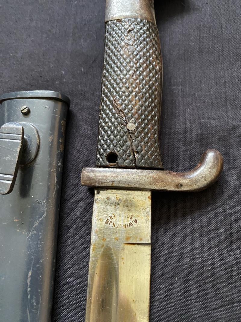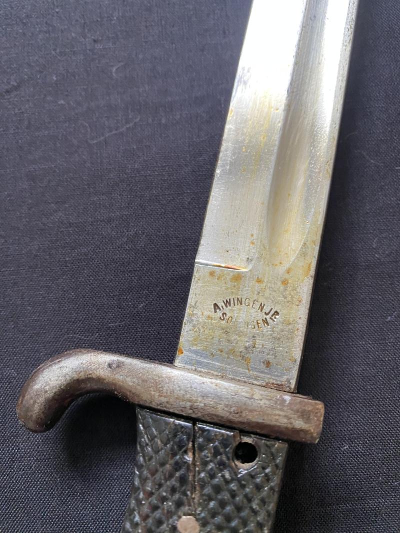 This is a WW2 German Dress Bayonet which has the makers A.Wingen Jr Solingen, thre is a split in the grip, the release button works perfectly and fitted with scabbard. Age Restricted Item. Proof of age must be provided. U.K. Sales Only.