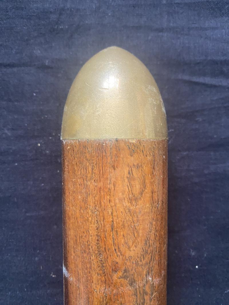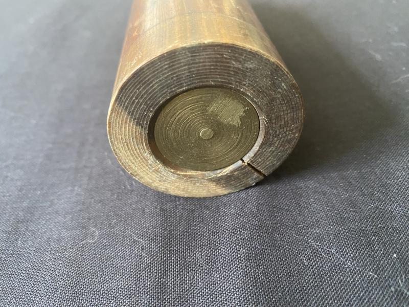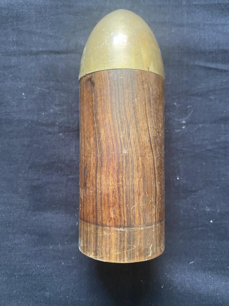 This is a45mm Wooden Trench art, there is a split down one side of the wood, Approx. 12.5cm tall.