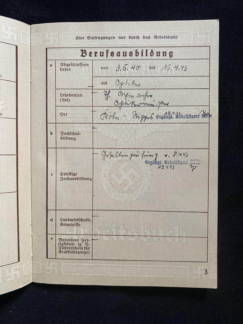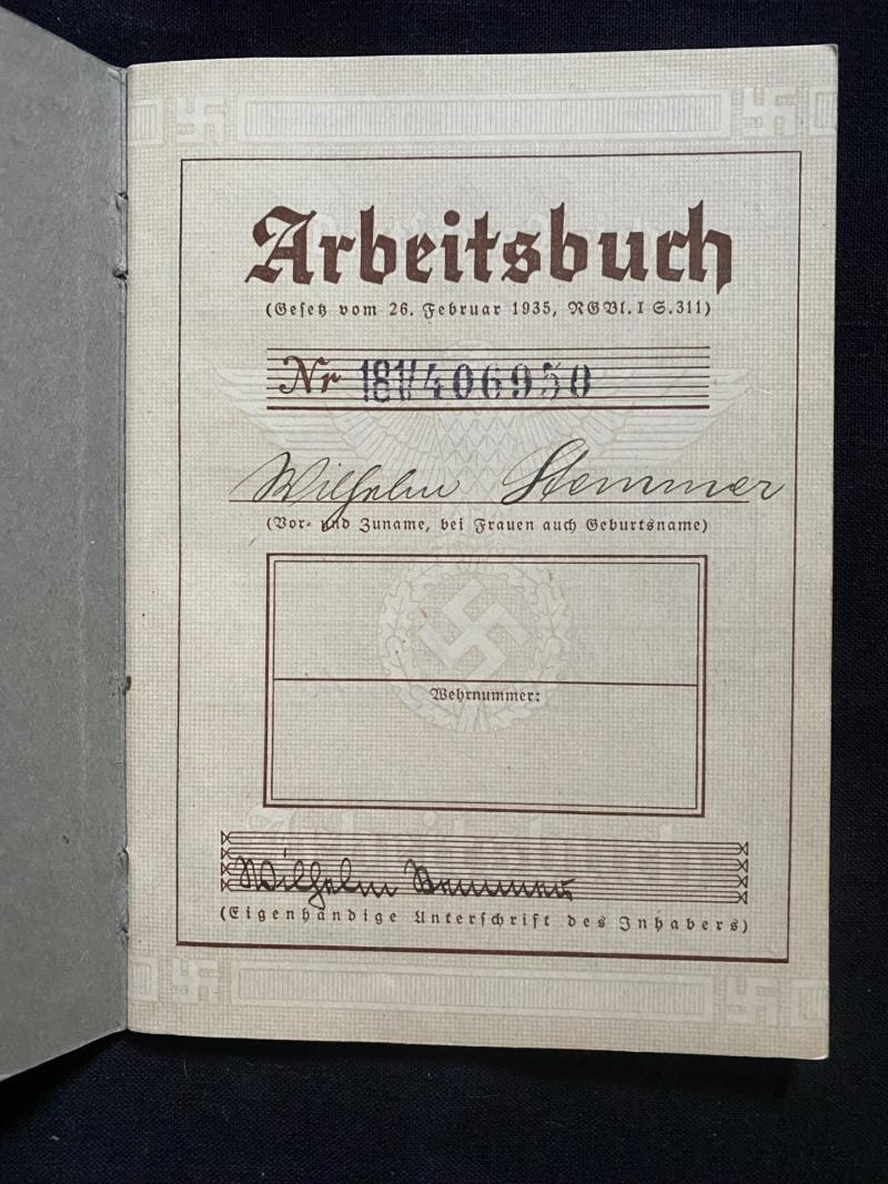This is a WW2 German Arbeitsbuch, the Swastika has been scraped of on this one.