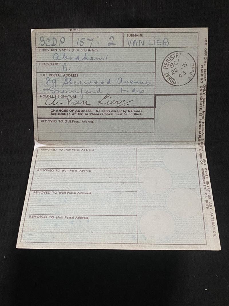 This is a WW2 National Registration Identity Card which is dated 1943 which looks like it belonged to a Abraham Van Lier.