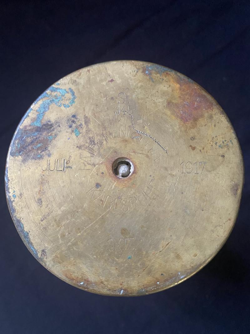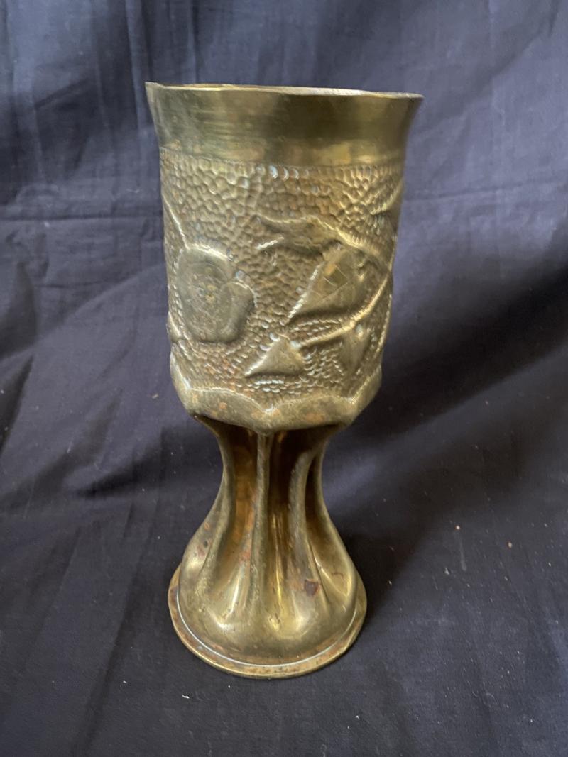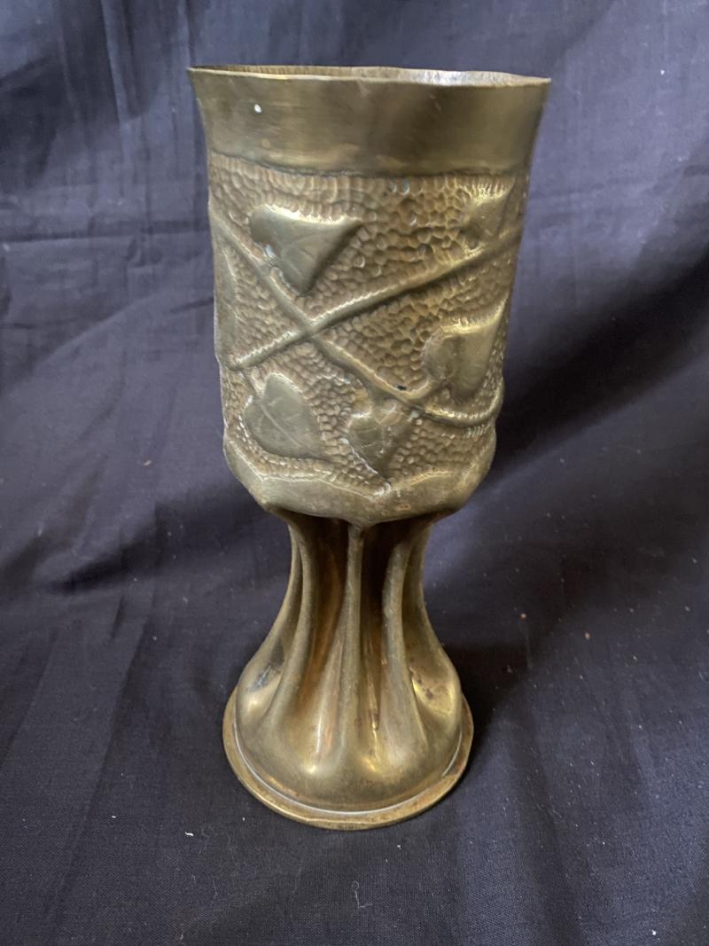 This is a WW1 Karlsruhe 1917 dated trench art shell which has been made into a goblet. Approx. 21cm tall.