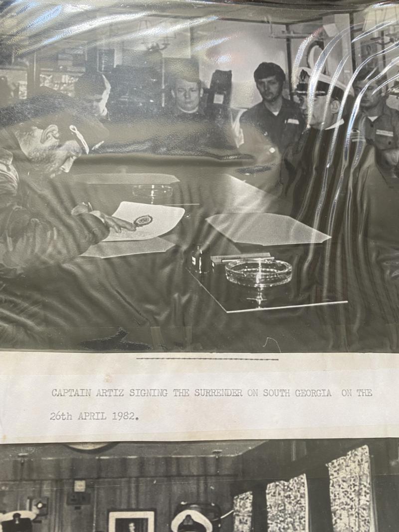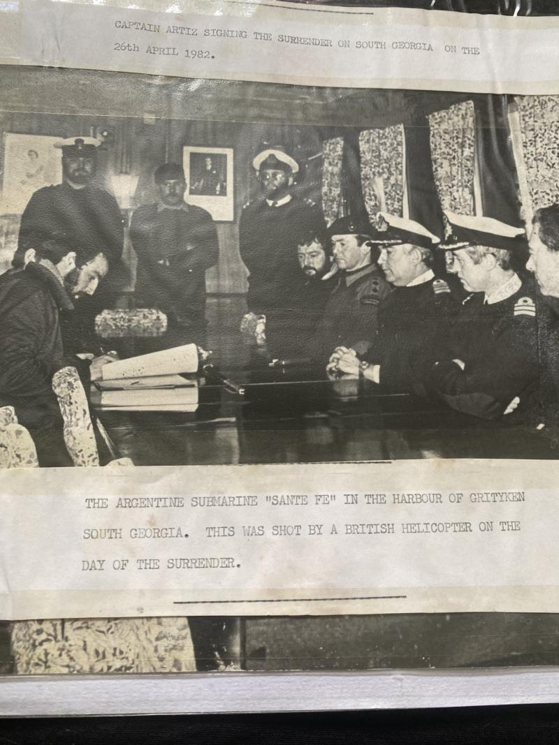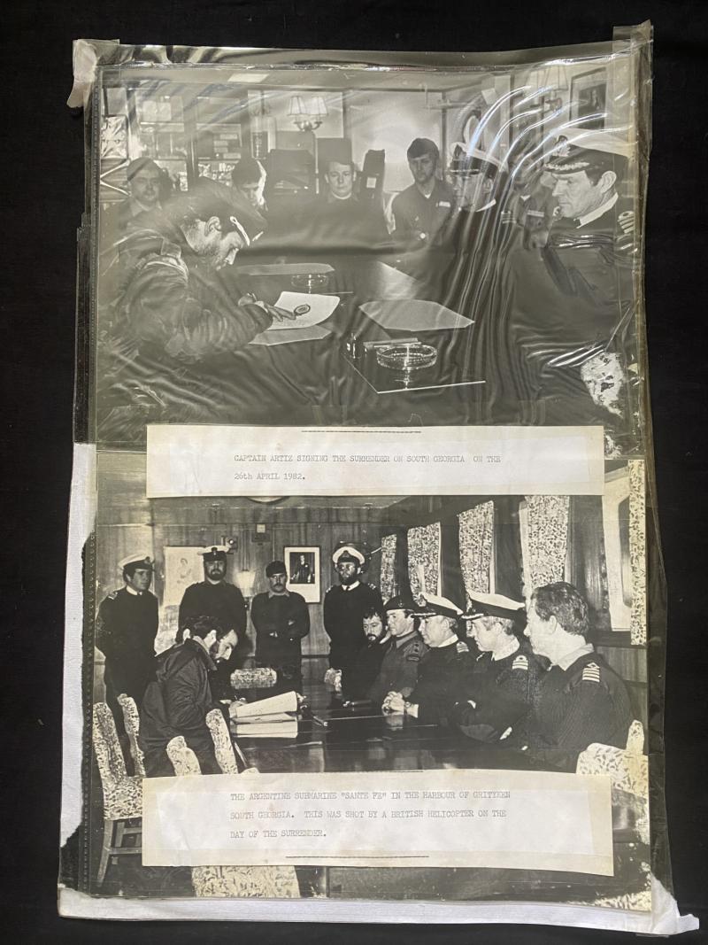 This is 2 x pictures of the surrender of Captain Artiz and the Argentine Submarine Sante Fe in South Georgia.