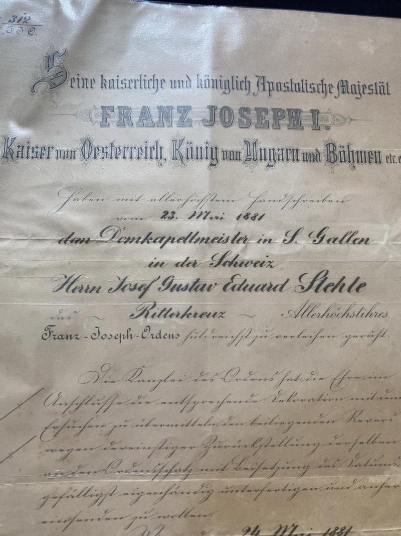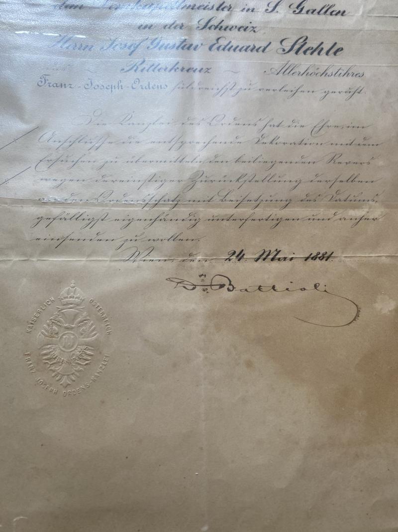 This is a very nice Franz Joseph I award document issuing a Knights Cross on the 23rd May 1881, some wear around the document as expected due to age.