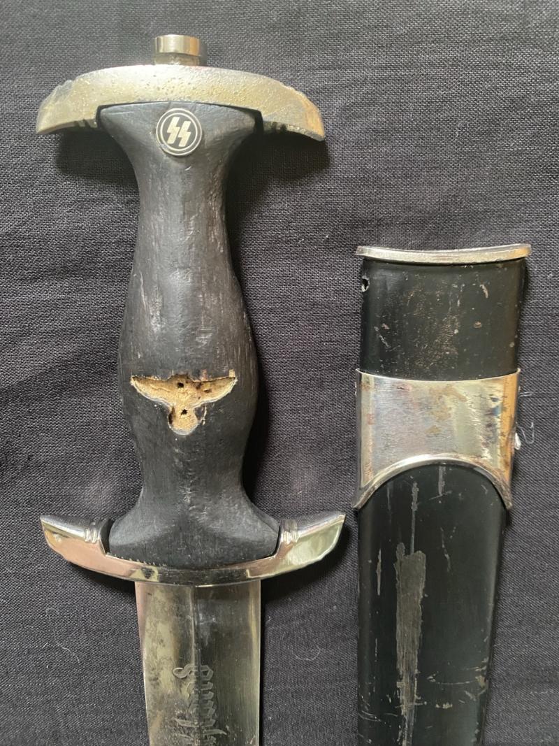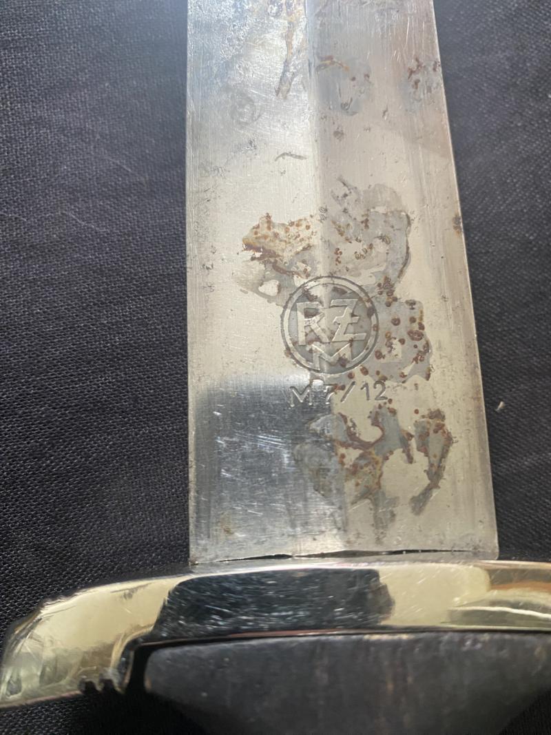 This is a rough WW2 German SS Officer's Dagger, with a SA blade, the blade has the inscription Alles Fur Deutschland and the makers RZM M7/12, a Max Weysburg blade, The Eagle is missing from the Handle but still has its SS runes at the top which is also RZM stamped on the back, I believe the cross guard has been replaced as it looks in better condition than the rest of the dagger but both are maker marked inside. Be good for parts or for a project. This is an age restricted item. Proof of age must be provided. U.K. Sales Only.