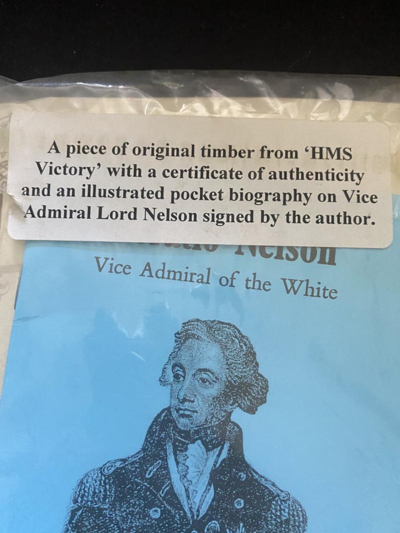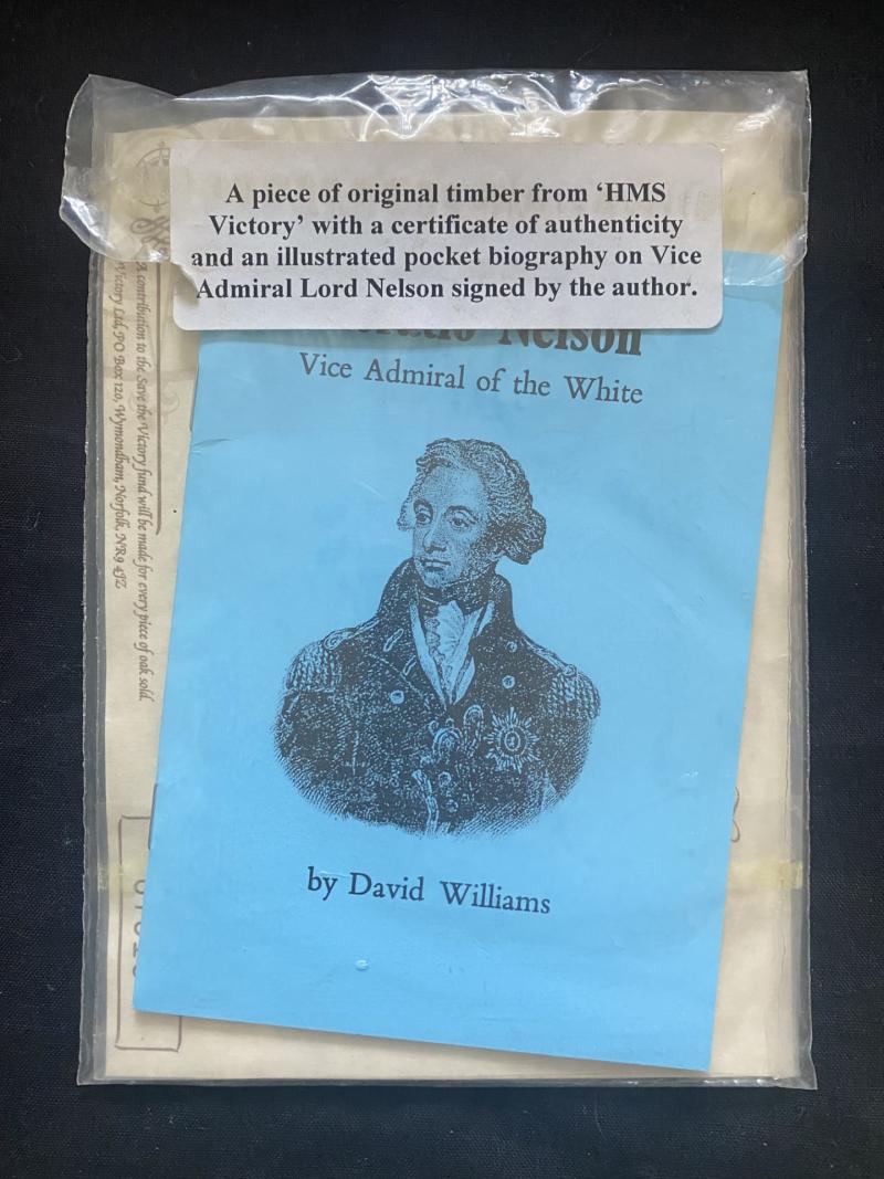 This is a original piece of Oak taken from HMS Victory with a certificate of authenticity and a illustrated pocket biography on Vice Admiral Lord Nelson, signed by the Author.