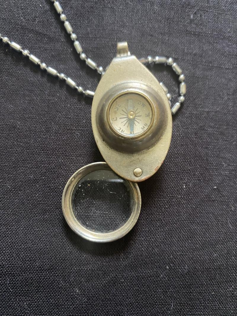 This is a nice British Compass & Magnifying glass on a chain, with made in England on the back.