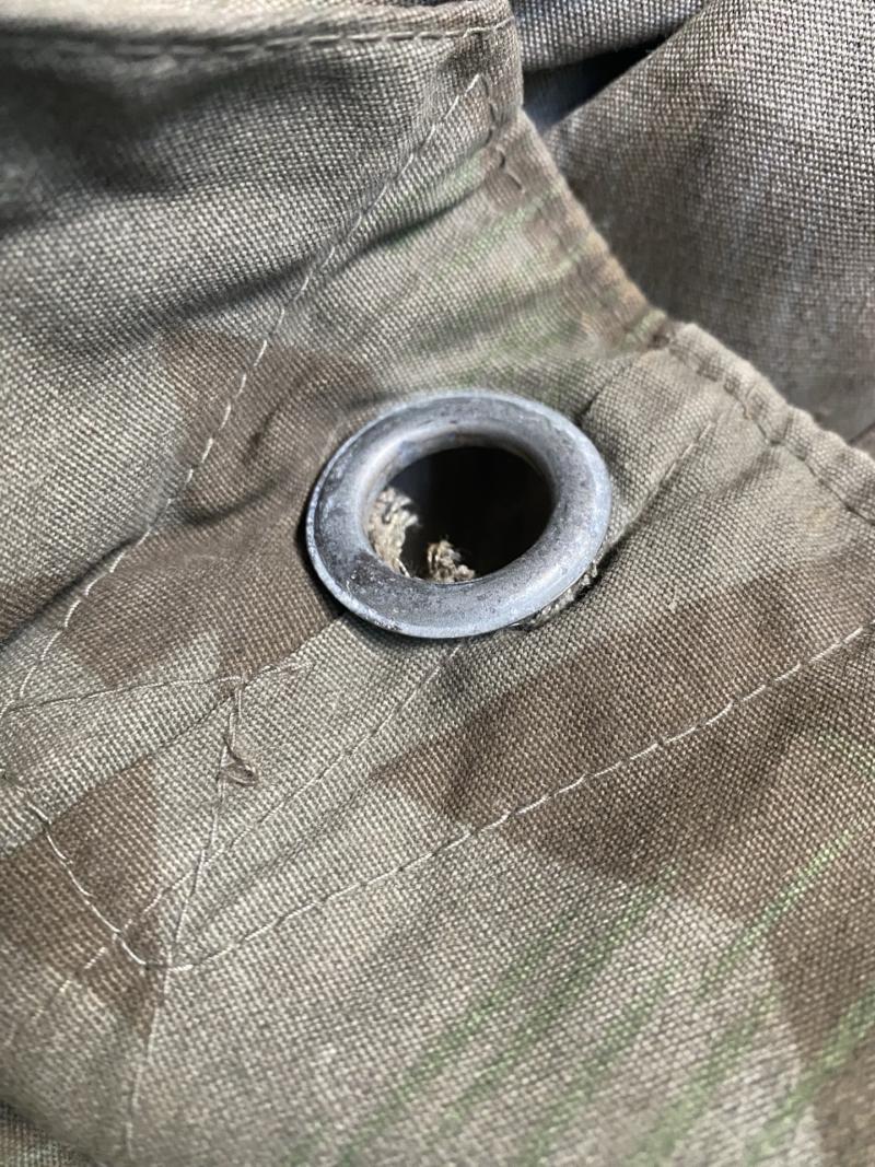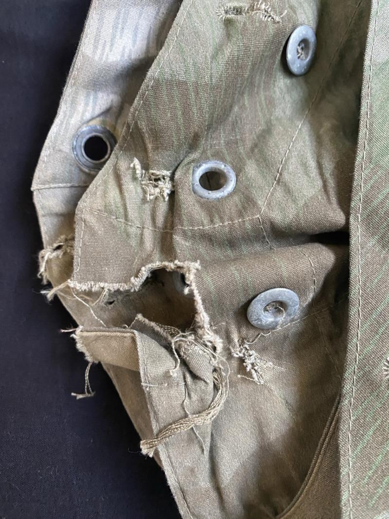 This is a slightly worn WW2 German Zeltbahn in the famous Splinter pattern camo, there are some tears to it, still maintains some of the rope attachment.