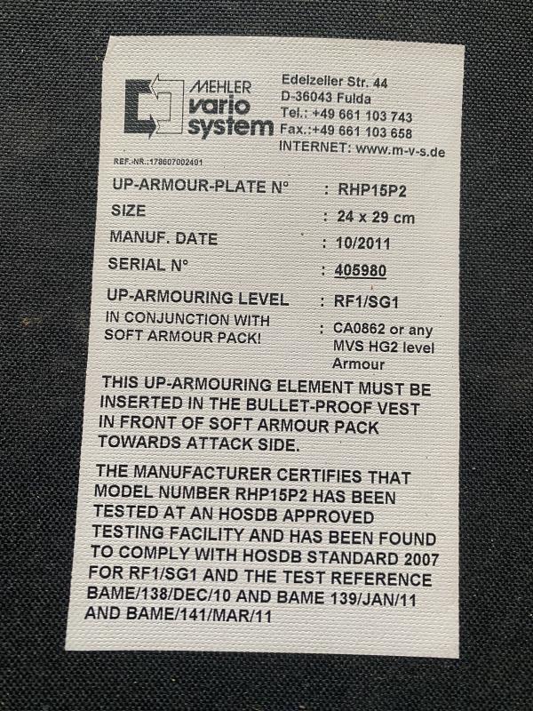 This is a nice UP-Armour plate with the level RF1/SG1, Size 24x29cm.