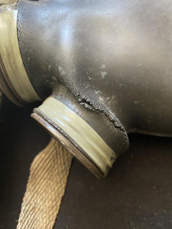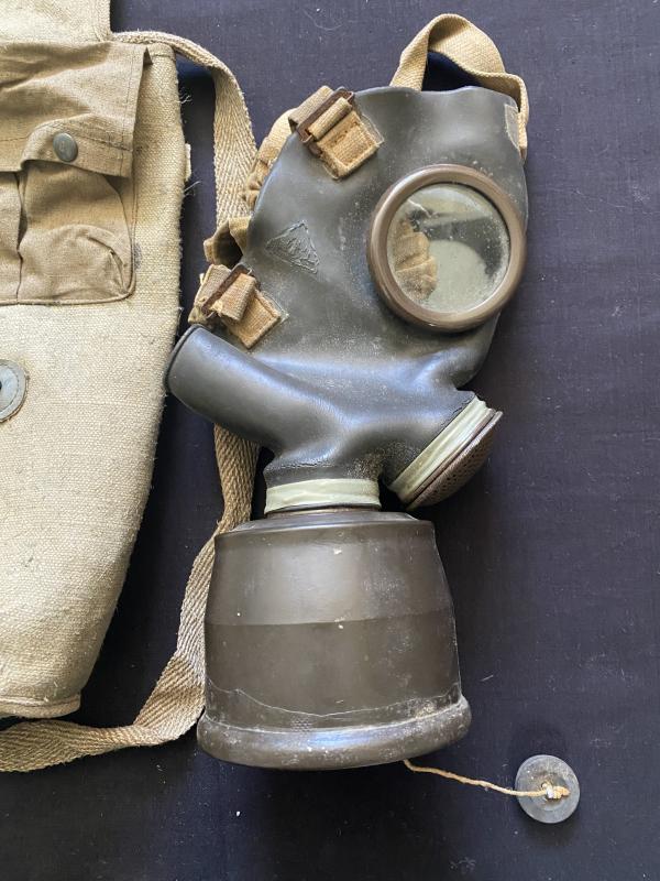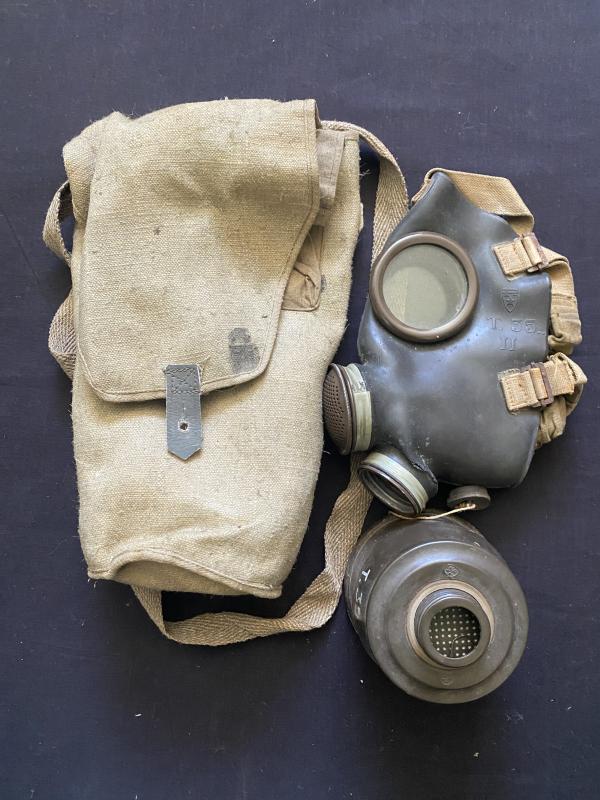 This is a WW2 Italian T.35 gas mask with a T.35 filter and a canvas pouch, the harness is in good condition, although there is a split in the rubber in the mask by the filter area, Display purposes only.