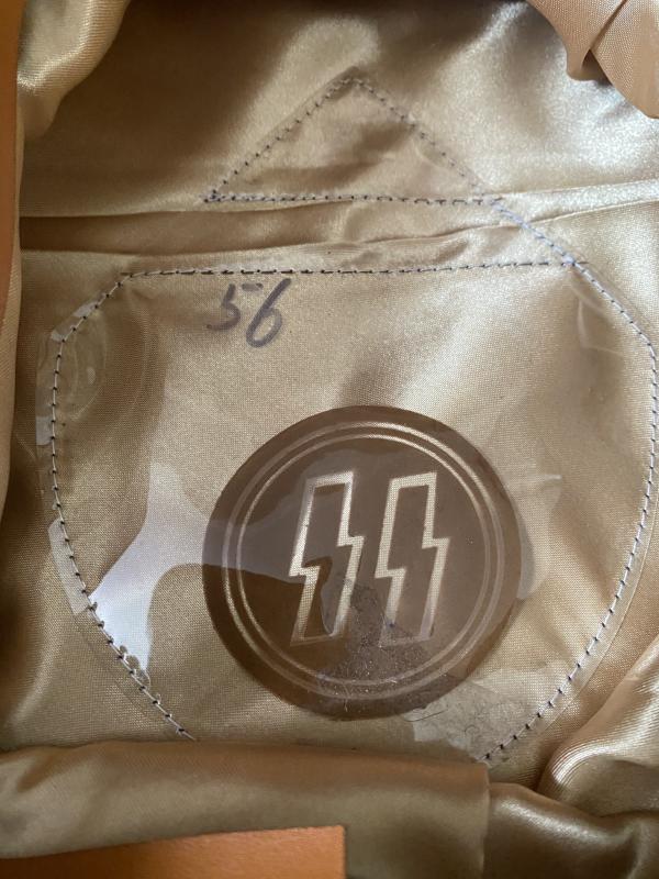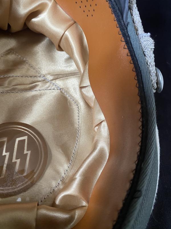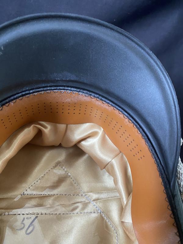 This is a very nice reproduction WW2 German SS Officer's Infantry Visor cap, still has its SS central lozenge with a nice Officers cord and Eagle and Wreath. It says 56 on the inside, but I think its a 58.