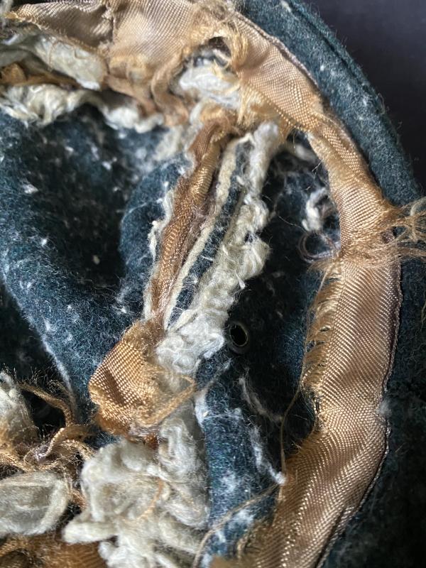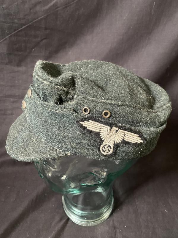 This is a very worn reproduction WW2 German SS M43 cap with the SS Skull to the front and the SS Eagle to the side, the liner has been shredded for some reason, Approx. size 56.
