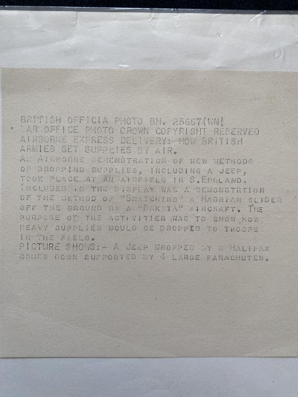 This is British official photo of the British Airborne dropping a jeep by a Bakata Aircraft.