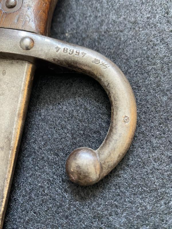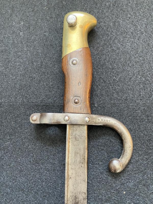 This is a nice 1879 dated French M1874 Gras Sword Bayonet, the wooden grips are in nice condition, the inscription on the spine is nice and clear. Age Restricted Item. Proof of age must be provided. U.K. Sales Only.