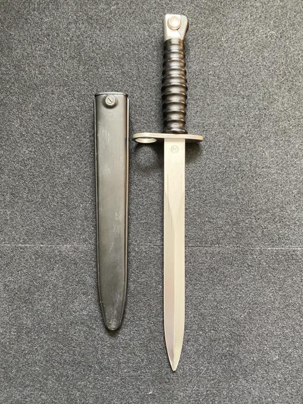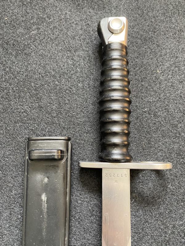 This is a Swiss SIG stgw MI957 Bayonet with Scabbard. This bayonet and scabbard are designed for use with the Swiss SIG stgw (Sturmgewehr) 57 assault Rifle, which was in production from 1957 to 1983. The bayonet features a ribbed plastic grip with a release catch guard. The blade is double-edged with a spear point and bears the makers mark. WF denoting the assembly by Waffenfabrik Bern. The serial number is W 517252. Age Restricted Item. Proof of age must be provided. U.K. Sales Only.