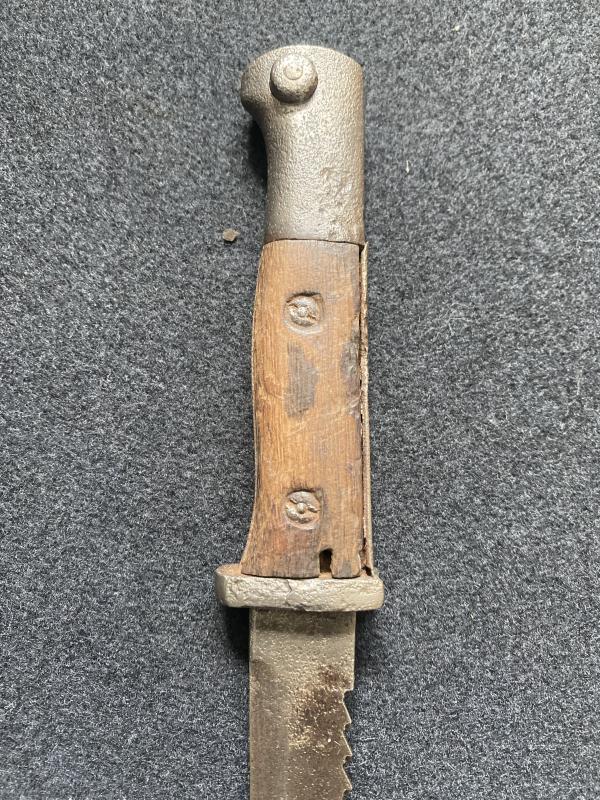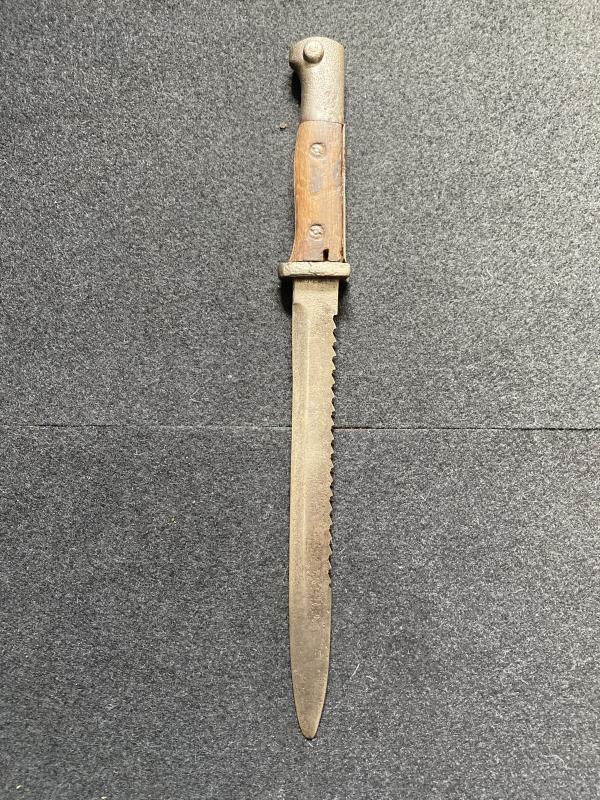 This is a well used WW1 German SG1884/98 Sawback bayonet with pitting to the metal work, still has its original wooden grips. This is an age restricted item. Proof of age must be provided. U.K. Sales Only.