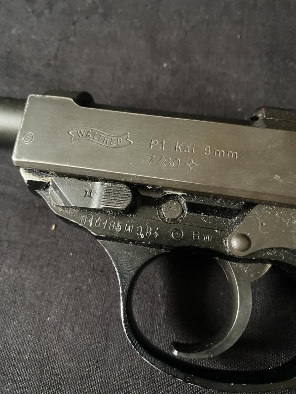 For sale to customers outside the European Union Only. This is a very nice P1 Pistol and is a post-war version of the P38 and was the standard sidearm used by the Bundeswehr to the end of the 1990's. All post-war P38/P1's where produced and maker marked by Walther. This example is in excellent condition Bundeswehr marked "BW" and dated July 1980 also fitted with a WW2 P38 Magazine. For Non EU Sales Only. However can be re-deactivated to the current EU specification. Please email before making purchase.