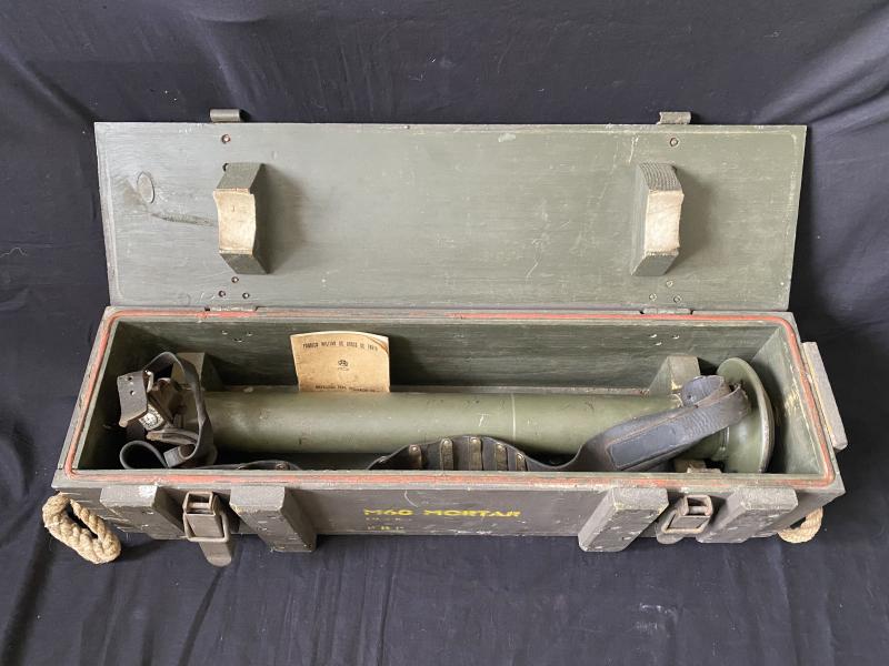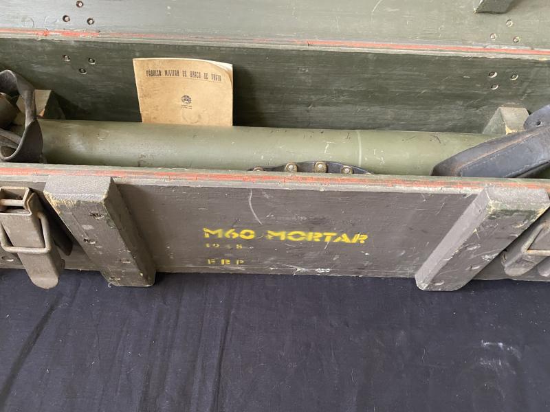 This is a very nice deactivated Portuguese FBP M968 60mm Mortar in its original crate which also comes with its leather sling and end cap, The latches on the crate work fine but the carry handles on the outside are in tact as can be seen in the pictures. This would make a great display piece. UK sales only.