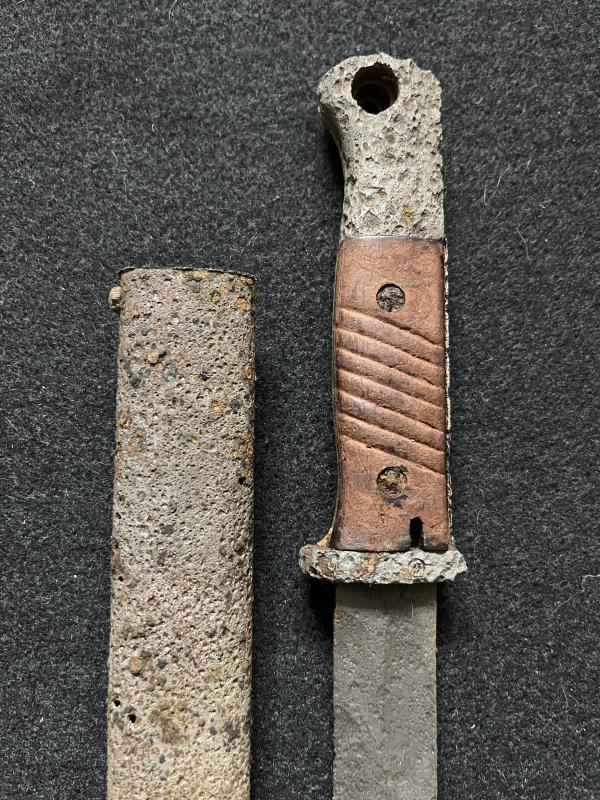 This is a nice relic WW2 German K98 Bayonet which still has its wooden grips and scabbard. This is an age restricted item. Proof of age must be provided. U.K. Sales Only.