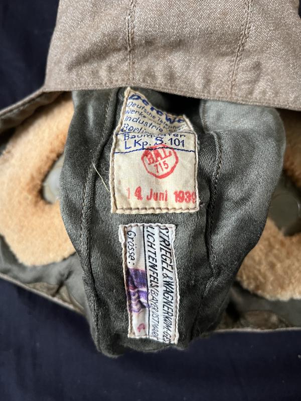 This is a very nice 1939 dated WW2 German Luftwaffe LKp S 101 Pilots helmet with its original labels inside and still fitted with its early throat mics and plug, the label is dated 14th June 1939 and is a size 56, this one has the Nr.26617, the ear pieces inside still has their plastic covers, overall a fantastic condition and would look fantastic in a collection.