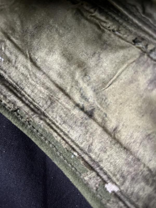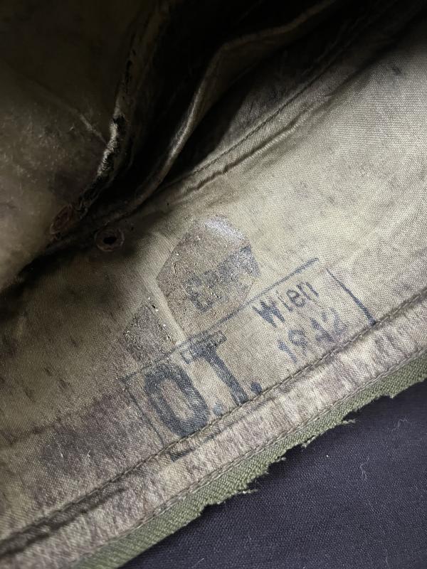 This is a very nice Salty WW2 German Todt "OT" Side cap, some damage to the outside and wear to the liner, can make out where the insignia use to be on the cap and has the letters and dated POW 1947 stitched into the side, when he was released. Has on the inside stamped O.T Wien and dated 1942, also on the other side it is stamped which looks like a size 58 but also what looks like the original guys name it belonged too.