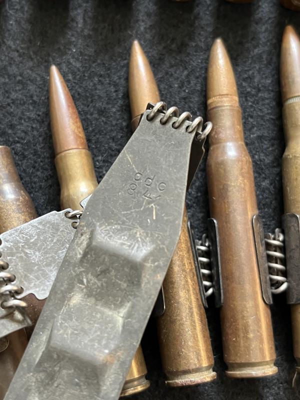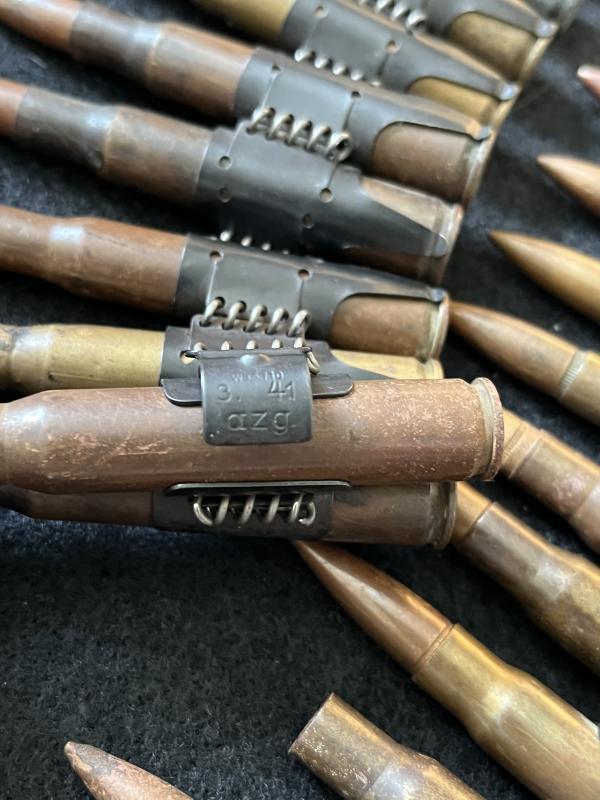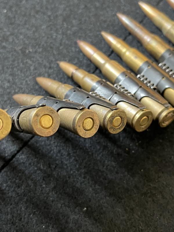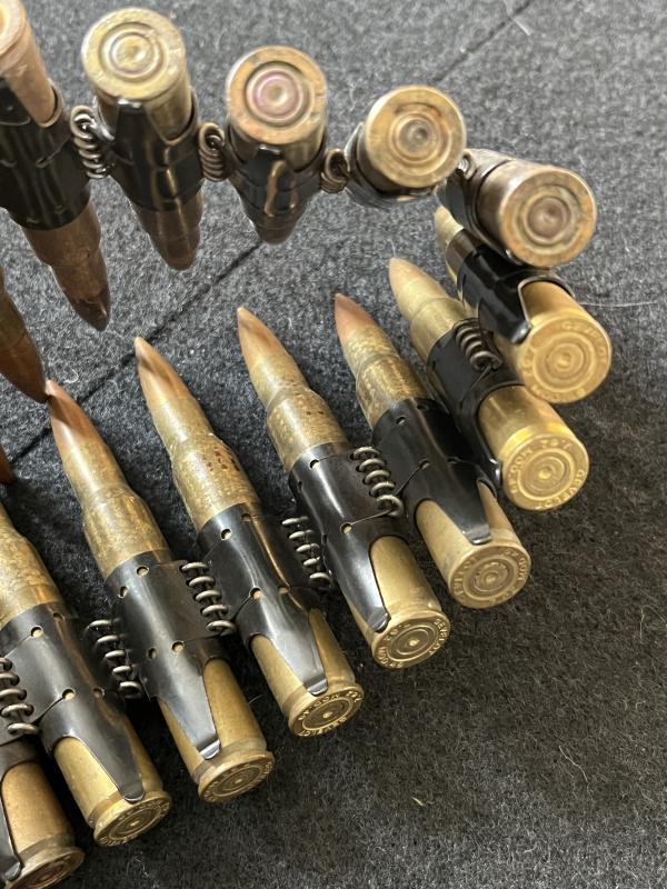 This is a belt of 48 x 7.92 inert rounds on a WW2 German belt and starter tab, one of the rounds is missing its projectile, also the rounds can vary, they will have different bases and 8 are unstruck inerts, the rounds are post War. UK sales only.
